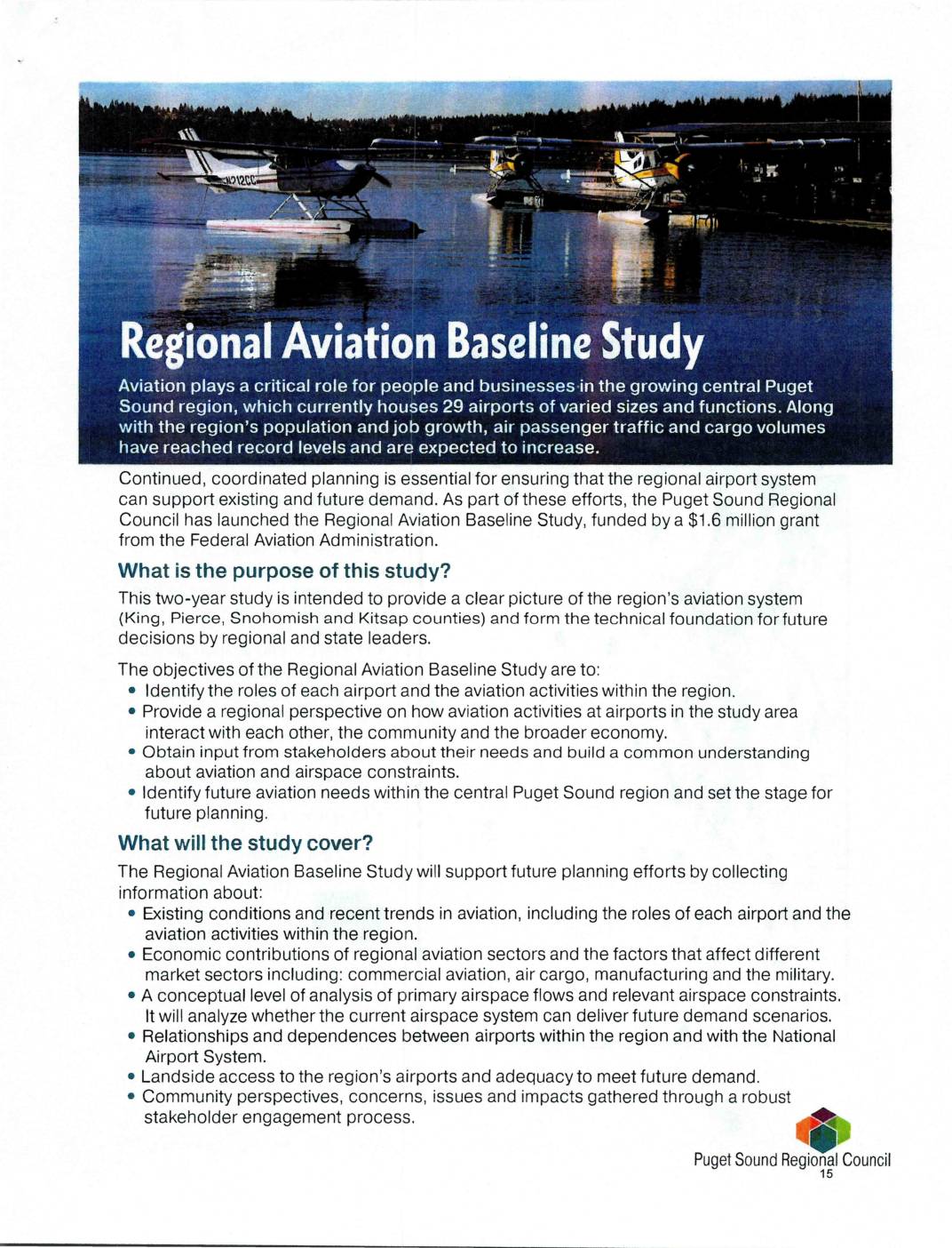 IjIIbII& Ib b 4 A$ 4 41ib + u n n + P,I'-wM-In -q IT• eBB II B -+ da / :’HW+j+' I&W L + '. HH + ::W Continued, coordinated planning is essential for ensuring that the regional airport system can support existing and future demand. As part of these efforts, the Puget Sound Regional Council has launched the Regional Aviation Baseline Study, funded by a $1.6 million grant from the Federal Aviation Administration. What is the purpose of this study? This two-'year study is intended to provide a clear picture of the region’s aviation system (King, Pierce, Snohomish and Kitsap counties) and form the technical foundation for future decisions by regional and state leaders. The objectives of the Regional Aviation Baseline Study are to: ' Identify the roles of each airport and the aviation activities within the region. Provide a regional perspective on how aviation activities at airports in the study area interact with each other, the community and the broader economy. Obtain input from stakeholders about their needs and build a common understanding about aviation and airspace constraints. Identify future aviation needs within the central Puget Sound region and set the stage for future planning. What will the study cover? The Regional Aviation Baseline Study will support future planning efforts by collecting information about: ' Existing conditions and recent trends in aviation, including the roles of each airport and the aviation activities within the region. • Economic contributions of regional aviation sectors and the factors that affect… -
