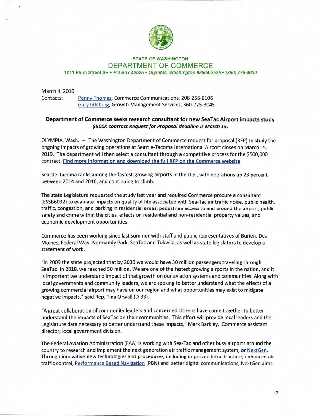 1011 Plum Street SE ' PO Box 42525 ' Olympia, Washington 98504-2525 • (360) 725-4000 March 4, 2019 Contacts: Penny Thomas, Commerce Communications, 206-256-6106 Gary Idlebu rg, Growth Management Services, 360-725-3045 Department of Commerce seeks research consultant for new SeaTac Airport impacts study $500K contract Request for Proposal deadline is March 15. OLYMPIA, Wash. – The Washington Department of Commerce request for proposal (RFP) to study the ongoing impacts of growing operations at Seattle-Tacoma International Airport closes on March 15, 2019. The department will then select a consultant through a competitive process for the $500,000 contract. Find more information and download the full RFP on the Commerce website Seattle-Tacoma ranks among the fastest-growing airports in the U.S., with operations up 23 percent between 2014 and 2016, and continuing to climb. The state Legislature requested the study last year and required Commerce procure a consultant (ESSB6032) to evaluate impacts on quality of life associated with Sea-Tac air traffic noise, public health, traffic, congestion, and parking in residential areas, pedestrian access to and around the airport, public safety and crime within the cities, effects on residential and non-residential property values, and economic development opportunities. Commerce has been working since last summer with staff and public representatives of Burien, Des Moines, Federal Way, Normandy Park, SeaTac and Tukwila, as well as state legislators to develop a statement of work. “In 2009 the state projected that by 2030 we would have 30 million passengers traveling through SeaTac. In 2018, we reached 50 million. We… -
