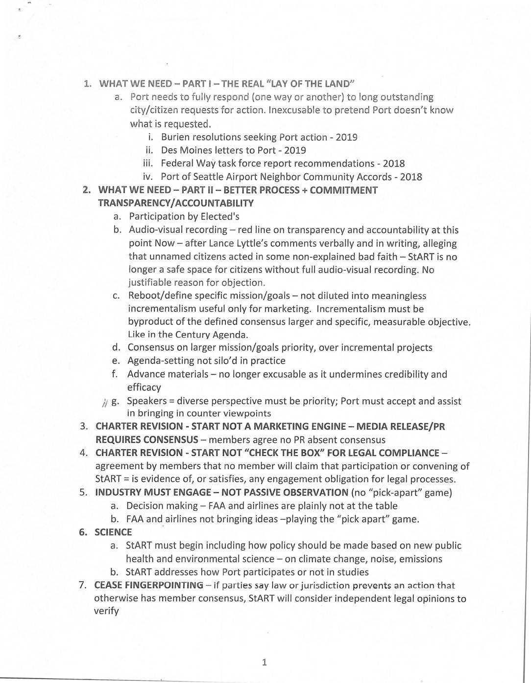 Port needs to fully respond (one way or another) to long outstanding city/citizen requests for action. Inexcusable to pretend Port doesn’t know what is requested. Burien resolutions seeking Port action - 2019i ii. Des Moines letters to Port - 2019 iii. Federal WaV task force report recommendations - 2018 iv. Port of Seattle Airport Neighbor Community Accords - 2018 2. WHAT WE NEED – PART II - BETTER PROCESS + COMMITMENT TRANSPARENCY/ACCOUNTABILITY a. Participation by Elected's b. Audio-visual recording – red line on transparency and accountability at this point Now – after Lance Lyttle’s comments verbally and in writing, alleging that unnamed citizens acted in some non-explained bad faith – StART is no longer a safe space for citizens without full audio-visual recording. No justifiable reason for objection. c. Reboot/define specific mission/goals – not diluted into meaningless incrementalism useful only for marketing. Incrementalism must be byproduct of the defined consensus larger and specific, measurable objective. Like in the Century Agenda. d. Consensus on larger mission/goals priority, over incremental projects e. Agenda-setting not silo’d in practice f. Advance materials – no longer excusable as it undermines credibility and efficacy }I g. Speakers = diverse perspective must be priority; Port must accept and assist in bringing in counter viewpoints 3. CHARTER REVISION - START NOT A MARKETING ENGINE – MEDIA RELEASE/PR REQUIRES CONSENSUS – members agree no PR absent consensus CHARTER REVISION - START NOT “CHECK THE BOX” FOR LEGAL COMPLIANCE – agreement by members that no member will claim that participation… -