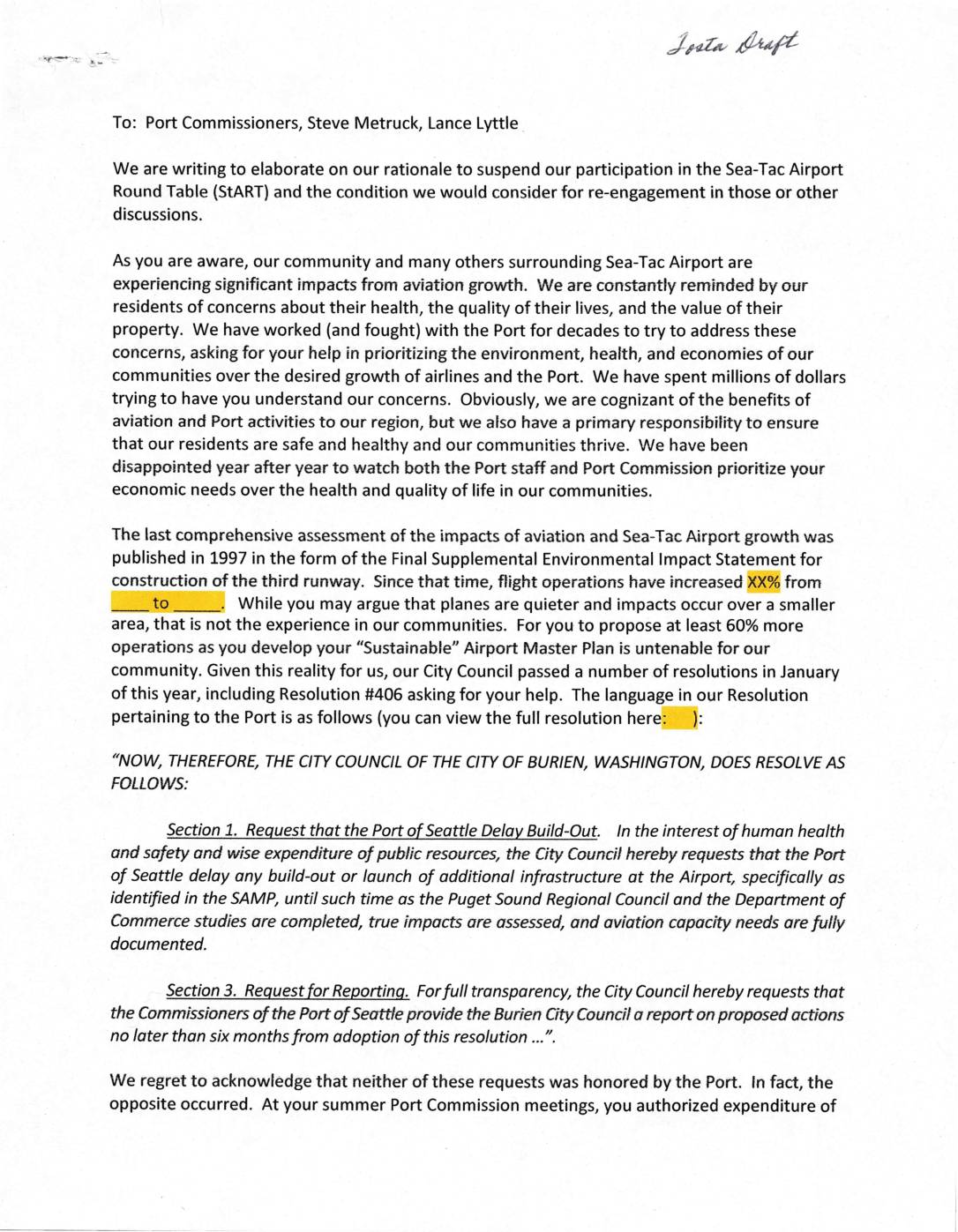 To: Port Commissioners, Steve Metruck, Lance Lyttle We are writing to elaborate on our rationale to suspend our participation in the Sea-Tac Airport Round Table (StART) and the condition we would consider for re-engagement in those or other discussions. As you are aware, our community and many others surrounding Sea-Tac Airport are experiencing significant impacts from aviation growth. We are constantly reminded by our residents of concerns about their health, the quality of their lives, and the value of their property. We have worked (and fought) with the Port for decades to try to address these concerns, asking for your help in prioritizing the environment, health, and economies of our communities over the desired growth of airlines and the Port. We have spent millions of dollars trying to have you understand our concerns. Obviously, we are cognizant of the benefits of aviation and Port activities to our region, but we also have a primary responsibility to ensure that our residents are safe and healthy and our communities thrive. We have been disappointed year after year to watch both the Port staff and Port Commission prioritize your economic needs over the health and quality of life in our communities. The last comprehensive assessment of the impacts of aviation and Sea-Tac Airport growth was published in 1997 in the form of the Final Supplemental Environmental Impact Statement for construction of the third runway. Since that time, flight operations have increased XX% from to . While you may argue that planes are quieter… -