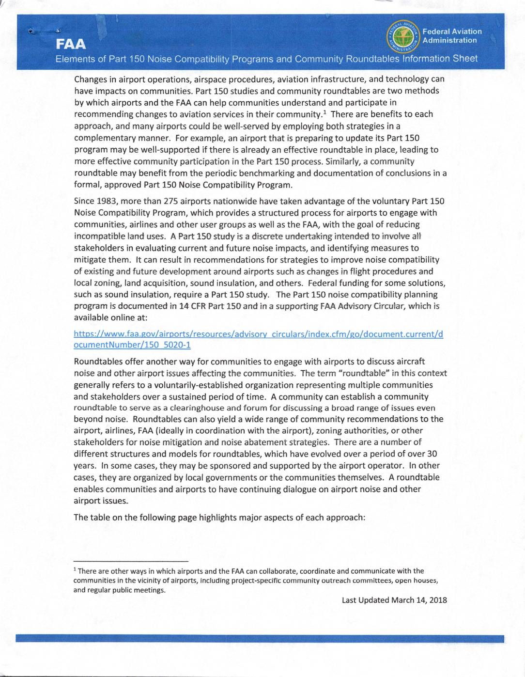 Changes in airport operations, airspace procedures, aviation infrastructure, and technology can have impacts on communities. Part 150 studies and community roundtabies are two methods by which airports and the FAA can help communities understand and participate in recommending changes to aviation services in their community.1 There are benefits to each approach, and many airports could be well-served by employing both strategies in a complementary manner. For example, an airport that is preparing to update its Part 150 program may be well-supported if there is already an effective roundtable in place, leading to more effective community participation in the Part 150 process. Similarly, a community roundtable may benefit from the periodic benchmarking and documentation of conclusions in a formal, approved Part 150 Noise Compatibility Program. Since 1983, more than 275 airports nationwide have taken advantage of the voluntary Part 150 Noise Compatibility Program, which provides a structured process for airports to engage with communities, airlines and other user groups as well as the FAA, with the goal of reducing incompatible land uses. A Part ISO study is a discrete undertaking intended to involve att stakeholders in evaluating current and future noise impacts, and identifying measures to mitigate them. It can result in recommendations for strategies to improve noise compatibility of existing and future development around airports such as changes in flight procedures and local zoning, land acquisition, sound insulation, and others. Federal funding for some solutions, such as sound insulation, require a Part 150 study. The Part 150 noise compatibility planning… -