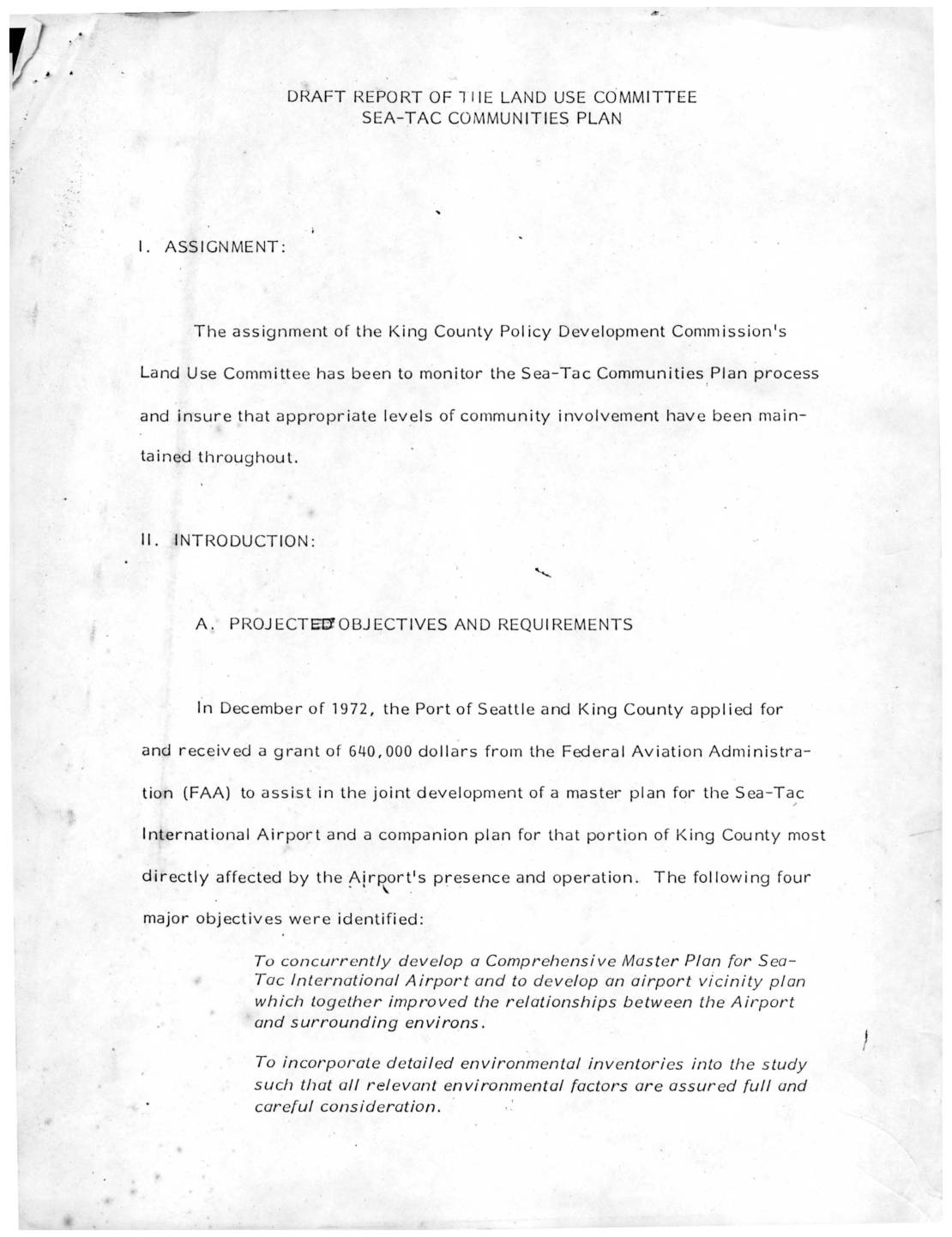 DRAFT REPORT OF TilE LAND USE COMMITTEE SEA-TAC COMMUNITIE~ PLAN . ; ,. The assignment of the King County Pol icy Development Commission 1s Land Use Committee has been to monitor the Sea-Tac Communities ,Pian process and insure that appropriate levels of community involvement have been main- tained throughout. II. INTRODUCTION : A. PROJECTEftOBJECTIVES AND REQUIREMENTS In December of 1972, the Port of Seattle and King County applied for and received a grant of 640,000 dollars from the Fed era I Aviation Admi nistra- tion (FAA) to assist in the joint development of a master plan for the Sea-Ta,c International Airport and a companion plan for that portion of King County most directly affected by the Airport 1s presence and operation .. The following four . '. . . major objectives were identified: To concurrently develop a Comprehensive Master Plan for Sea- Tac International Airport and to develop an airport vicinity plan which together improved the relationships between the Airport and surrounding environs. To incorporate detailed environmental inventories into the study such that all relevant environmental factors are assured full and careful consideration. ) .. .. To proceed in a manner which fully addresses the advantages and disadvantages associated with each and every potential viable plan alternative and provide {or adequate public involvement in all such deliberation. To develop {ina/ recommendations soundly based on all pertinent technical, economic, social, environmental and financial factors, which provide {or the adoption of specific implementation policies on behalf of the Port of Seattle, King… -
