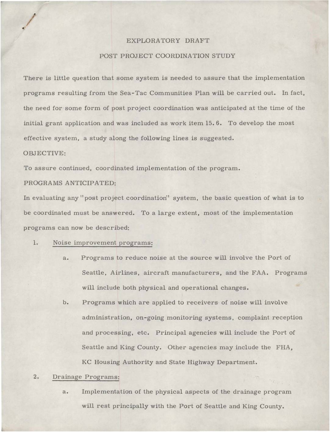 There is little question that some system is needed to assure that the implementation programs resulting from the Sea-Tac Communities Plan will be carried out. In fact, the need for some form of post project coordination was anticipated at the time of the initial grant application and was included as work item 15. 6. To develop the most effective system, a study along the following lines is suggested. OBJECTIVE: To assure continued, coordinated implementation of the program. PROGRAMS ANTICIPATED: In evaluating any 11 post project coordination" system, the basic question of what is to be coordinated must be answered. To a large extent, most of the implementation programs can now be described: 1. Noise improvement programs: a. Programs to reduce noise at the source will involve the Port of Seattle, Airlines, aircraft manufacturers, and the FAA. Programs will include both physical and operational changes. b. Programs which are applied to receivers · of noise will involve administration, on-going monitoring systems, complaint reception and processing, etc. Principal agencies will include the Port of Seattle and King County. Other agencies may include the FHA, KC Housing Authority and State Highway Department. 2. Drainage Programs: a. Implementation of the physical aspects of the drainage program will rest principally with the Port of Seattle and King County. • • Other related agencies may be involved, such as the State Highway Department, Metro, Corp of Engineers, etc. Emphasis will be in terms of carrying out capital improvement projects. b. Administration of land development controls to… -