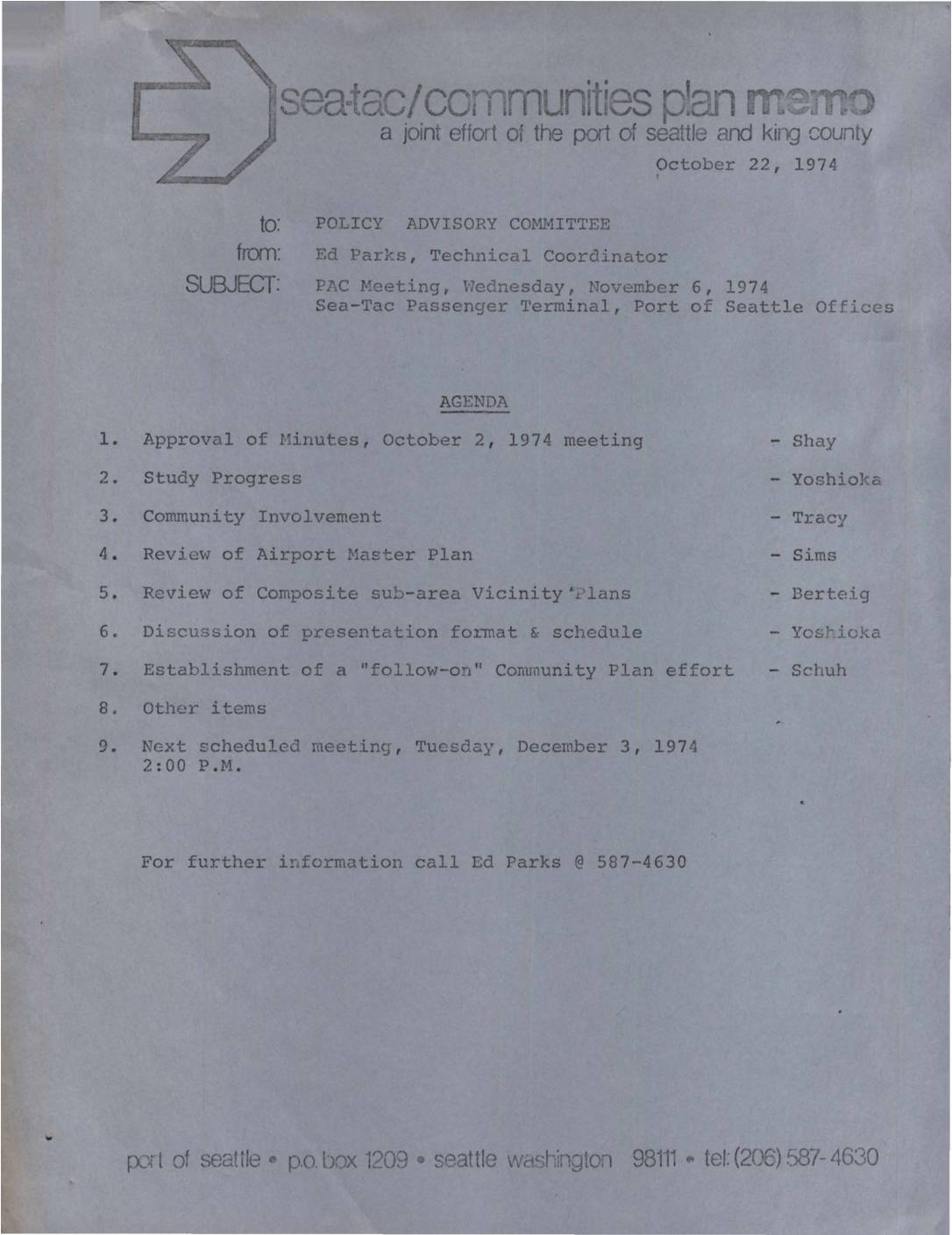 seaotac/ COiT'rrlUnitl8S p!aJ1 1 b ~ · • · a joint effort of the port of seattle and king county October 22, 1974 ' to: POLICY ADVISORY COMMITTEE from: Ed Parks, Technical Coordinator SUBJECT: PAC Meeting, Wednesday, November 6, 1974 Sea-Tac Passenger Terminal, Port of Seattle Offices AGENDA 1. Approval of Minutes, October 2, 1974 meeting 2. Study Progress 3. Conununity Involvement 4. Review of Airport Master Plan 5. Review of Composite sub-area Vicinity'?lans 6. Discussion of p:cesentation format & schedule 7. Establishment of a "follow-on" Community Plan effort 8. Other items 9. Next scheduled meeting, Tuesday, December 3, 1974 2:00 P.M. For further i~formation call Ed Parks @ 587-4630 - Shay - Yoshioka - Tracy - Sims - Berteig - Ycshioka - Schuh rxx t of sea tile r 0 l· ~"'X 1"0. ·g • ~eattle ~V. c·j•:-~g. tO'l ,J. , ) •' c... ' ~ ••' f.i,,) ;.! • I 98l11 (II tel: (206) 587- 4630 -