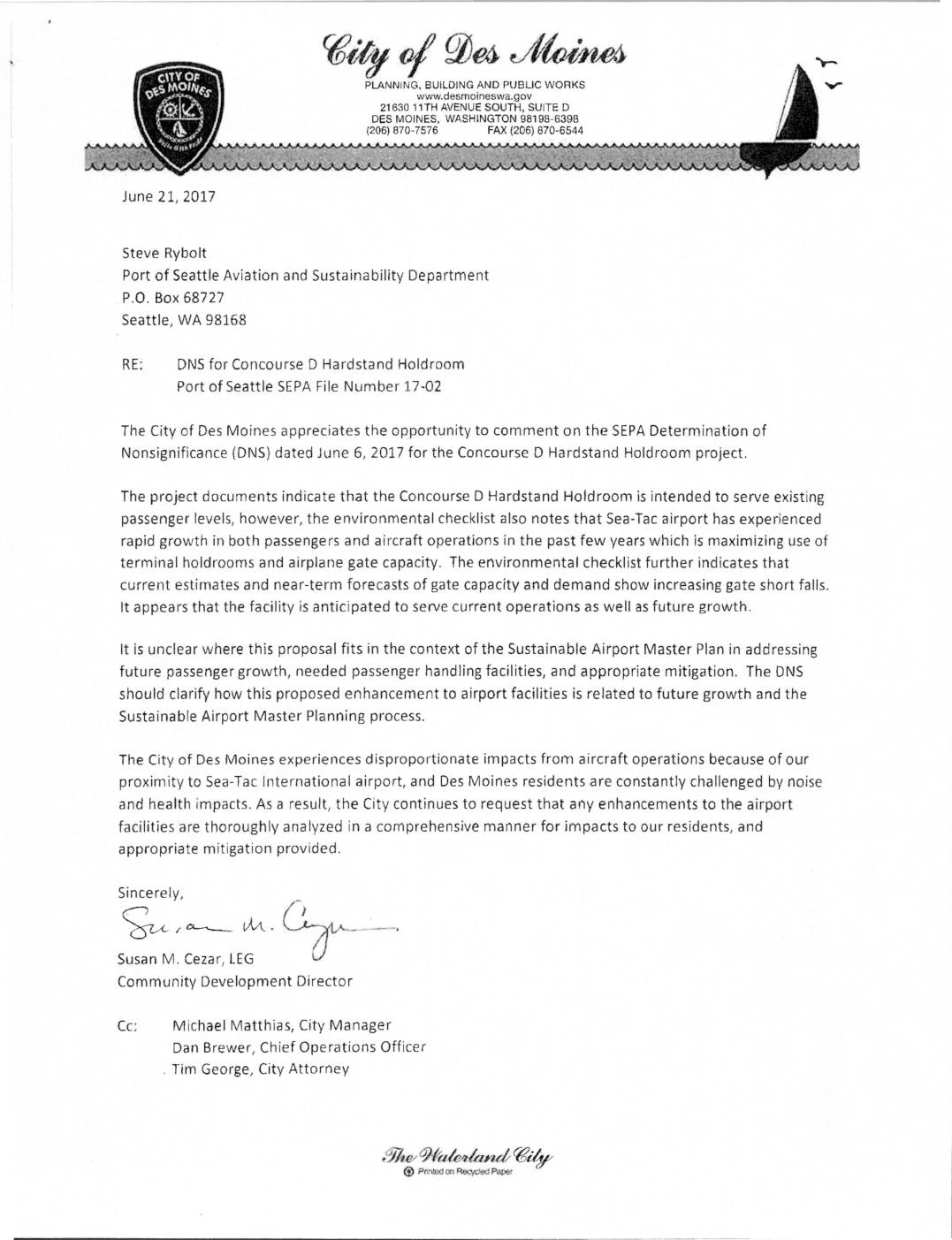 Port of Seattle Aviation and Sustainability Department P.O. Box 68727 Seattie, WA 98168 RE: DNS for Concourse D Hardstand Holdroom Port of Seattle SEPA File Number 17-02 The City of Des Moines appreciates the opportunity to comment on the SEPA Determination of Nonsignificance {DNS) dated June 6, 20:17 for the Concourse D Hardstand Holdroom project. The project documents indicate that the Concourse D Hardstand Holdroom is intended to serve existing passenger levels, however, the environrnental checklist also notes that Sea-Tac airport has experienced rapid growth in both passengers and aircraft operations in the past few years which is maximizing use of terminal holdrooms and airplane gate capacity. The environmental checklist further indicates that current estimates and near-term forecasts of gate capacity and demand show increasing gate short falls. It appears that the facility is anticipated to serve current operations as well as future growth. It is unclear where this proposal fits in the context of the Sustainable Airport Master Plan in addressing future passenger growth, needed passenger handling facilities, and appropriate mitigation. The DNS should clarify how this proposed enhancement to airport facilities is related to future growth and the Sustainable Airport Master Planning process. The City of Des Moines experiences disproportionate impacts from aircraft operations because of our proximity to Sea-Tac International airport, and Des Moines residents are constantly challenged by noise and health impacts. As a result, the City continues to request that any enhancements to the airport facilities are thoroughly analyzed in a comprehensive manner for impacts…