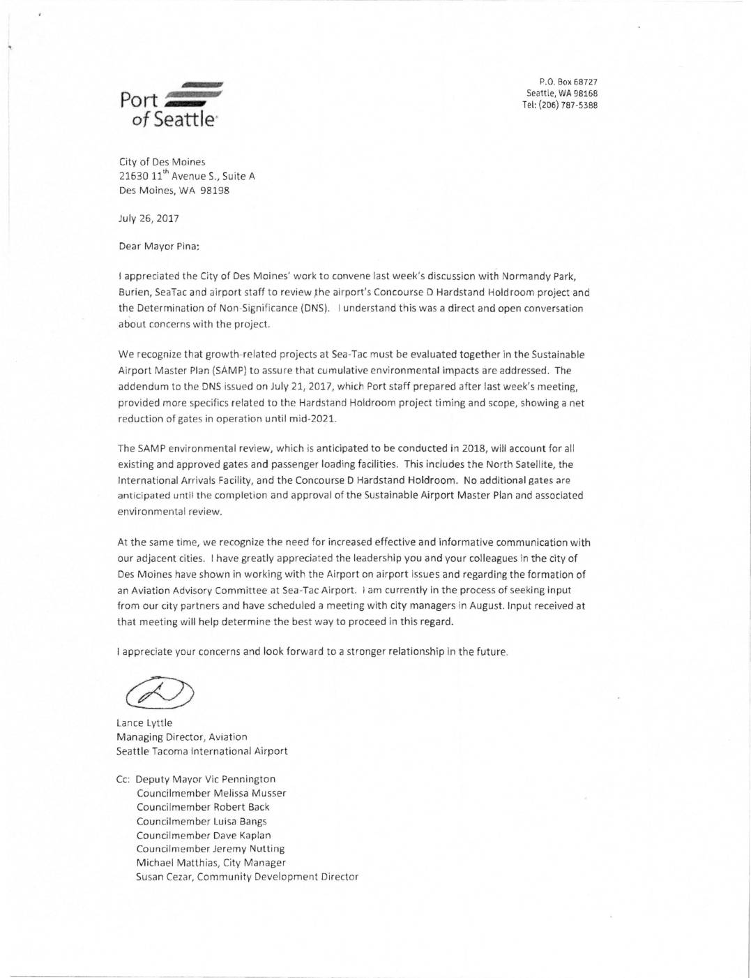 appreciated the City of Des Moines’ work to convene last week’s discussion with Normandy Park, Burien, SeaTac and airport staff to review Xhe airport’s Concourse D Hardstand Hold room project and the Determination of Non–Significance (DNS). I understand this was a direct and open conversation about concerns with the project. We recognize that growth-related projects at Sea-Tac must be evaluated together in the Sustainable Airport Master Plan (SAMP) to assure that cumulative environmental impacts are addressed. The addendum to the DNS issued on July 21, 2017, which Port staff prepared after last week’s meeting, provided more specifics related to the Marcistand Hotdroom project timing and scope, showing a net reduction of gates in operation until mid-2021. The SAMP environmental review, which is anticipated to be conducted in 2018, will account for all existing and approved gates and passenger loading facilities. This includes the North Sate}lite, the international Arrivats Facility, and the Concourse D Hardstand Holdroom. No additional gates are anticipated until the completion and approval of the Sustainable Airport Master Plan and associated environmental review, At the same time, we recognize the need for increased effective and informative communication with our adjacent cities. I have greatly appreciated the leadership you and your colleagues in the city of Des Moines have shown in working with the Airport on airport issues and regarding the forrnation of an Aviation Advisory Comrnittee at Sea-Tac Airport. i am currently in the process of seeking input from our city partners and have scheduled a meeting with… -