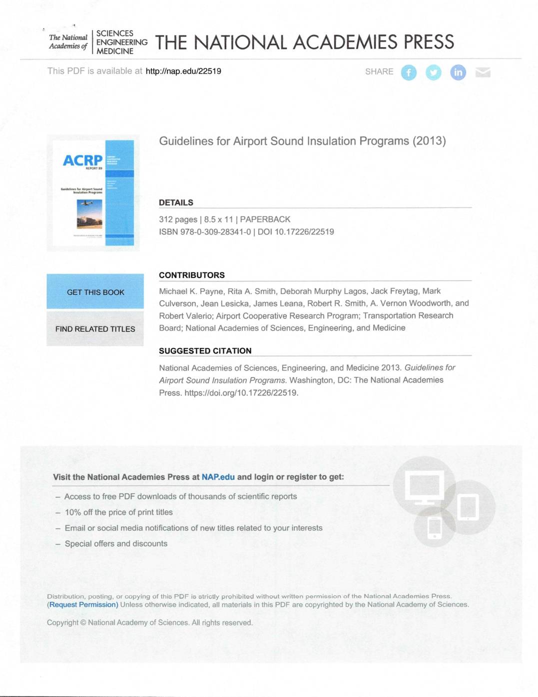 This PDF is availahle at http://nap.edu/22519 ; i1:n: HFHrF&mInPIaAm n&& r O Guidelines for Airport Sound Insulation Programs (2013) KCRF R£POlrr B9 DETAILS 312 pages 1 8.5 x 11 1 PAPERBACK ISBN 978-o-309-28341-o I DOI 10.17226/22519 CONTRIBUTORS GET THIS BOOK Michael K. Payne, Rita A. Smith, Deborah Murphy Lagos, Jack Freytag, Mark Culverson, Jean Lesicka, James Leana, Robert R. Smith, A. Vernon WoodwoNh, and Robert Valerio; Airport Cooperative Research Program; Transportation Research Board; National Academies of Sciences, Engineering, and MedicineFIND RELATED TITLES SUGGESTED CITATION National Academies of Sciences, Engineering, and Medicine 2013. Guidelines for Airport Sound Insulation Programs. Washington, DC: The National Academies Press. https://doi.org/10.17226/22519. Visit the National Academies Press at NAP.edu and login or register to get: Access to free PDF downloads of thousands of scientific reports I09£ off the price of print titles Email or social media notifications of new tides related to your interests Special offers and discounts Distribution, p08ting, or copying of thi6 PDF ie 6trict ly prohibited without written permission of the National Academies Press. (Request Permission) Unless otherwise indicated, all materials in this PDF are copyrighted by the National Academy of Sciences. Copyright © National Academy of Sciences. All rights reserved . Guidelines for Airport Sound Insulation Programs FOREWORD By Theresia H. Schatz Staff Officer Transportation Research Board ACRP Report 89: Guidelines for Airport Sound Insulation Programs provides updated guidelines for sound insulation of residential and other noise-sensitive buildings for poten- tial use by airport and non-airport sponsors to develop and effectively manage their… -