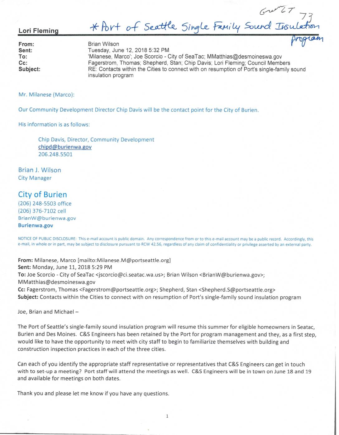 ’Milanese, Marco'; Joe Scorcio - City of SeaTac; MMatthias@desmoineswa.gov Fagerstrom, Thomas; Shepherd, Stan; Chip Davis; Lori Fleming; Council Members RE: Contacts within the Cities to connect with on resumption of Port's single-family sound insulation program Mr. Milanese (Marco): Our Community Development Director Chip Davis will be the contact point for the City of Burien. His information is as follows: Chip Davis, Director, Community Development chipd@burienwa .gov 206.248.5501 Brian J. Wilson City Manager City of Burien (206) 248-5503 office (206) 376-7102 cell BrianW@burien wa .gov Bu rienwa .gov NOTiCE OF PUBLIC DiSCLOSURE: This e-mail account is public domain. Any correspondence from or to this e-mail account may be a public record. Accordingly/ this e-mail, in whole or in part, may be subject to disclosure pursuant to RCW 42.56, regardless of any claim of confidentiality or privilege asserted by an external party. From: Milanese, Marco [mailto:Milanese.M@portseattle.org] Sent: Monday, June 11, 2018 5:29 PM To: Joe Scorcio - City of SeaTac <jscorcio@ci.seatac.wa.us>; Brian Wilson <BrianW@burienwa.gov>; M Matthias@desmoineswa .gov Cc: Fagerstrom, Thomas <Fagerstrom@portseattle.org>; Shepherd, Stan <Shepherd .S@ portseattle.org> Subject: Contacts within the Cities to connect with on resumption of Port's single-family sound insulation program Joe, Brian and Michael – The Port of Seattle’s single-family sound insulation program will resume this summer for eligible homeowners in Seatac, Burien and Des Moines. C&S Engineers has been retained by the Port for program management and they, as a first step, would like to have the opportunity to meet with city staff to begin to familiarize themselves with… -