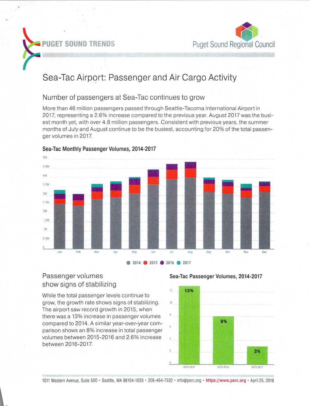 Sea--Tac Airport: Passenger and Air Cargo Activity Number of passengers at Sea---Tac continues to grow More than 46 million passengers passed through Seattle-Tacoma International Airport in 2017, representing a 2.6% increase compared to the previous year. August 2017 was the busi- est month yet, with over 4.8 million passengers. Consistent with previous years, the summer months of July and August continue to be the busiest, accounting for 20% of the total passerI- ger volumes in 2017. Sea-Tac Monthly Passenger Volumes, 2014-2017 ShA $$ h ii tX::;}: iii!! ! !! ;it:: hiI$: @g§ ##ii iiI ??gig!;;B: Si }] III:i?;i;I ian feb Mil! ;?I- faaif JEn L}Ui Au-q @ 2014 + 2015 e 2016 e 2017 Sep act Nav Dec Passenger volumes show signs of stabilizing Sea-Tac Passenger Volumes, 2014-2017 While the total passenger levels continue to grow, the growth rate shows signs of stabilizing. The airport saw record growth in 2015, when there was a 13% increase in passenger volumes compared to 2014. A similar year-over-year com- parison shows an 8% increase in total passenger volumes between 2015-2016 and 2.6% increase between 2016-2017. ;I:it;}L)i:}}}$ # 2(3:4 20iS 20i5 201 6 203 1) 2027 1011 Western Avenue, Suite 500 ' Seattle, WA 98104-1035 ' 206-464-7532 ' info@psrc.org ' https://www.psrc.org ' April 25, 2018 Rapid growth in air cargo activity Sea-Tac Air Cargo Volumes, 2014-2017 While growth in passenger travel shows signs of stabilizing, air cargo continues its rapid increase. Over 425,895 metric tons of cargo passed through the airport in 2017. Most… -