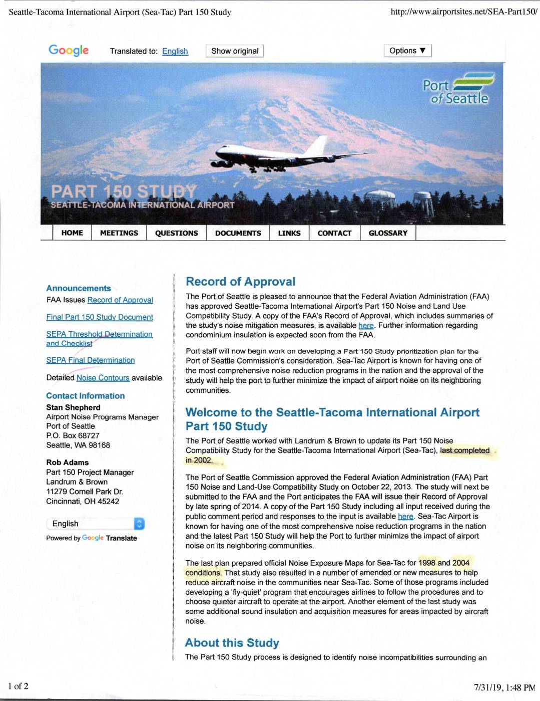 Seattle-Tacoma International Airport (Sea-Tac) Part 150 Study http://www.airportsites .net/SEA-Part 150/ Google Translated to: English HaN tP>::i’I HOME MErriNGS QUESIIONS Announcements FAA Issues Record of Approval Final Part 150 Study Document SEPA Threshold, Determination and Checklist SEPA Final Determination Detailed Noise Contours available / IN 41 + sn+ Contact Information Stan Shepherd Airport Noise Programs Manager Port of Seattle P.O. Box 68727 Seattle, WA 98168 Rob Adams Part 150 Project Manager Landrum & Brown 11279 Cornell Park Dr Cincinnati, OH 45242 English $11} Powered by GD g ie Translate Options VShow original GLOSSARYLINKS coFrrAcrDOCUMEMrs Record of Approval The Port of Seattle is pleased to announce that the Federal Aviation Administration (FAA) has approved Seattle-Tacoma International Airport's Part 150 Noise and Land Use Compatibility Study. A copy of the FAA's Record of Approval, which includes summaries of the study’s noise mitigation measures, is available Mr £_ Further information regarding condominium insulation is expected soon from the FAA. ; Port staff will now begin work on developing a Part 150 Study prioritization plan for the Port of Seattle Commission’s consideration. Sea-Tac Airport is known for having one of the most comprehensive noise reduction programs in the nation and the approval of the study will help the port to further minimize the impact of airport noise on its neighboring communities. ; Welcome to the Seattle-Tacoma International Airport Part 150 Study The Port of Seattle worked with Landrum & Brown to update its Part 150 Noise Compatibility Study for the Seattle-Tacoma International Airport (Sea-Tac), lad„completed… -
