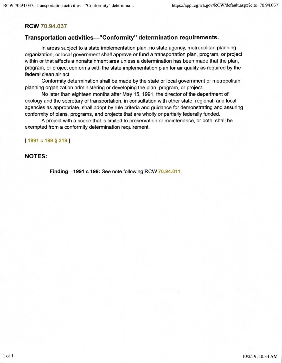 RCW 70.94.037: Transportation activities– "Conformity" determina... https://app leg.wa.gov/RCW/default .aspx?cite=70.94.037 RCW 70.94.037 Transportation activities–"Conformity" determination requirements. In areas subject to a state implementation plan, no state agency, metropolitan planning organization, or local government shall approve or fund a transportation plan, program, or project within or that affects a nonattainment area unless a determination has been made that the plan, program, or project conforms with the state implementation plan for air quality as required by the federal clean air act Conformity determination shall be made by the state or local government or metropolitan planning organization administering or developing the plan, program, or project. No later than eighteen months after May 15, 1991, the director of the department of ecology and the secretary of transportation, in consultation with other state, regional, and local agencies as appropriate, shall adopt by rule criteria and guidance for demonstrating and assuring conformity of ptarts, programs, and projects that are who}}y' or parbatty federaHy funded. A project with a scope that is limited to preservation or maintenance, or both, shall be exempted from a conformity determination requirement. [ 1991 c 199 § 219.] NOTES: Finding–1991 c 199: See note following RCW 70.94.611. of 10/2/19, 10:34 AM -