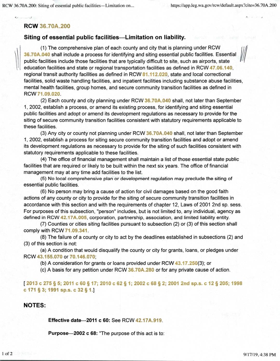 RCW 36.70A.200: Siting of essential public facilities–Limitation on... https://app.leg.wa.gov/rcw/default .aspx?cite=36.70A.200 RCW 36.7QA.200 Siting of essential public facilities–Limitation on liability. \ (1) The comprehensive plan of each county and city that is planning under RCVV t:A 3$.7©A.©4© shall include a process for identifying and siting essen Bat pubftc facifiHes. Essential //// public facilities include those facilities that are typically difficult to site, such as airports, state pIt education facilities and state or regional transportation facilities as defined in RCW 47.€>6.340, regional transft authority facilities as de6ned in RCW $q. q': 2,{}2G, state and local correctional facilities, solid waste handling facilities, and inpatient facilities including substance abuse facilities, mental health facilities, group homes, and secure community transition facilities as defined in ROW 7§,©$.©2© (2) Each county and city planning under ROW 36.78A.840 shall, not later than September 1, 2002, establish a process, or amend its existing process, for identifying and siting essential public facilities and adopt or amend its development regulations as necessary to provide for the siting of secure community transition facilities consistent with statutory requirements applicable to these facilities. (3) Any city or county not planning under RCW 36,7€)A.04€) shall, not later than September 1, 2002, establish a process for siting secure community transition facilities and adopt or amend its development regulations as necessary to provide for the siting of such facilities consistent with statutory requirements applicable to these facilities. (4) The office of $nanciat management shall ma}ntain a tist of those essential state pubtic facilities that are required or… -