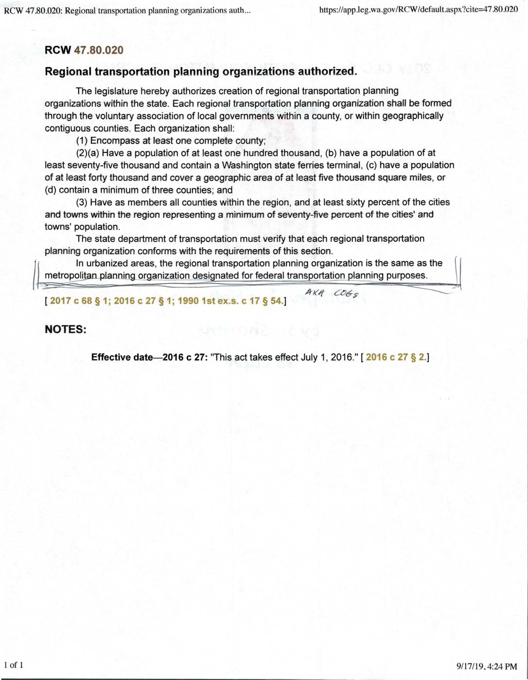 RCW 47.80.020: Regional transportation planning organizations audI.., https://app]eg.wa.gov/RCW/default ,aspx?cites+7.80.020 RCW 47.80.020 Regional transportation planning organizations authorized The legislature hereby authorizes creation of regional transportation planning organizations within the state. Each regional transportation planning organization shall be fonned through the voluntary association of local governments within a county, or within geographically contiguous counties. Each organization shall: (1) Encompass at least one complete county; (2)(a) Have a population of at least one hundred thousand, (b) have a population of at least seventy-five thousand and contain a Washington state ferries terminal, (c) have a population of at least forty thousand and cover a geographic area of at least five thousand square miles, or (d) contain a minimum of three counties; and (3) Have as members all counties within the region, and at least sixty percent of the cities and towns within the region represent}ng a minimum of seventy-five percent of the cibes' and towns' population. The state department of transportation must verify that each regional transportation planning organization conforms with the requirements of this section In urbanized areas, the regional transportation planning organization is the same as the metropolibnplanrling olr anizati_Qn®_s_ignated for federal transportation planning purposes [ 2017 c 68 § '1; 2016 c 27 § 1; 1990 1 st ex.s. c 17 § 54.] NOTES EWective date 2016 c 27: "This act takes effect July 1, 2016.’' [ 2€:)16 c 27 § 2.] of 9/17/19. 4:24 PM -
