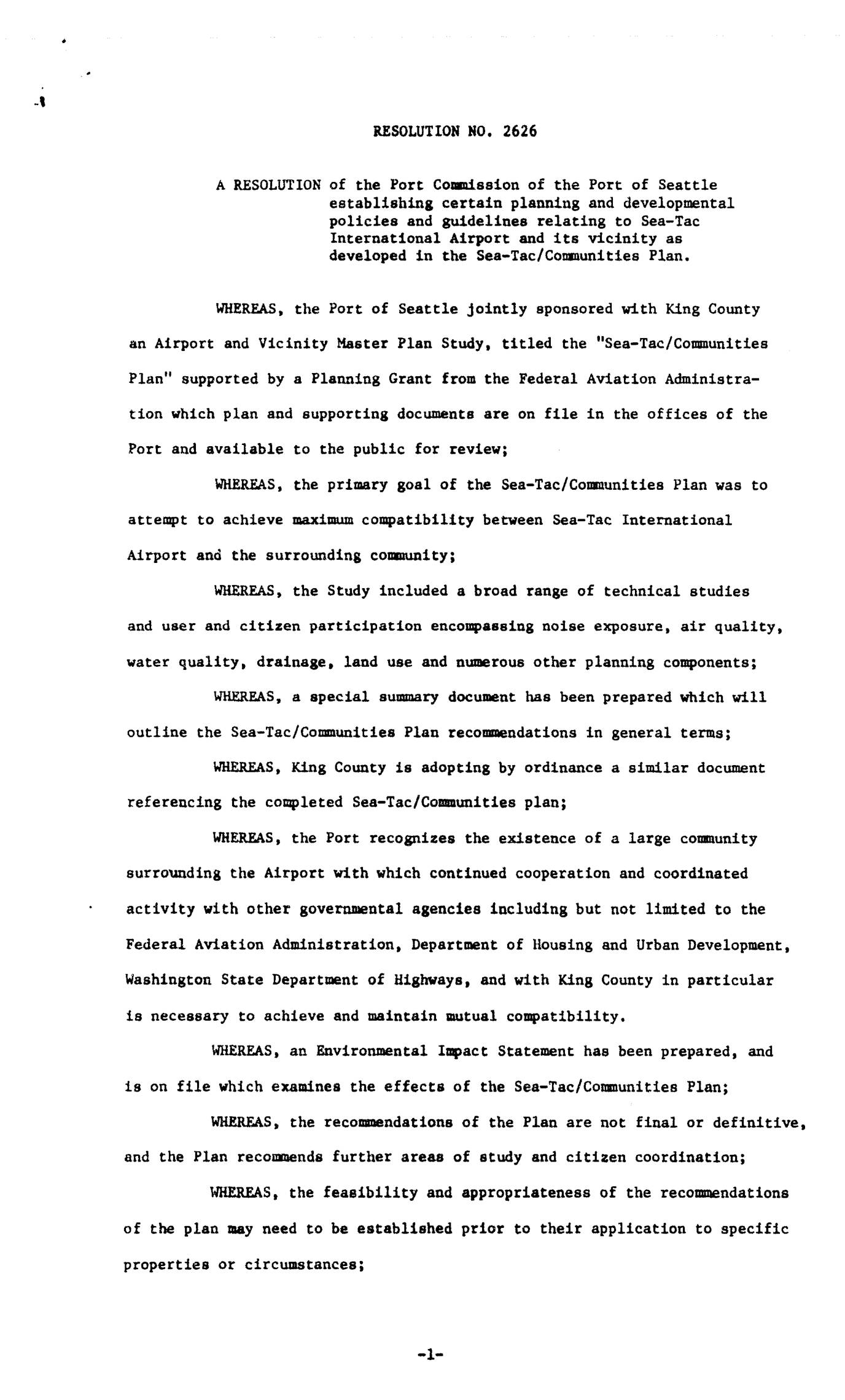 A RESOLUTION of the Port CoPlPission of the Port of Seattle establishing certain planning and developmental policies and guidelines relating to Sea-Tac International Airport and its vicinity as developed in the Sea-Tac/Conmunities Plan. WHEREAS, the Port of Seattle jointly sponsored with King County an Airport and Vicinity Master Plan Study, titled the "Sea-Tac/Communities Plan" supported by a Planning Grant from the Federal Aviation Ahinistra- tion which plan and supporting documents are on file in the offices of the Port and available to the public for review; WHEREAS, the primary goal of the Sea-Tac/Comunities Plan was to attempt to achieve maximum compatibility between Sea-Tac International Airport and the surrounding community; WHEREAS, the Study included a broad range of technical studies and user and citizen participation encompassing noise exposure, air quality, water quality, drainage, land use and numerous other planning components; WHEREAS, a special suxuary document has been prepared which will outline the Sea-Tac/Communities Plan recommendations in general terns; WHEREAS, King County is adopting by ordinance a similar document referencing the completed Sea-Tac/Communities plan; WHEREAS, the Port recognizes the existence of a large cornunity surrounding the Airport with which continued cooperation and coordinated * activity with other governmental agencies including but not limited to the Federal Aviation Administration, Department of Housing and Urban Development, Washington State Department of Highways, and with King County in particular is necessary to achieve and maintain mutual compatibility. WHEREAS, an Environmental Impact Statement has been prepared, and is on file which examines the effects of the Sea-Tac/Comunities… -