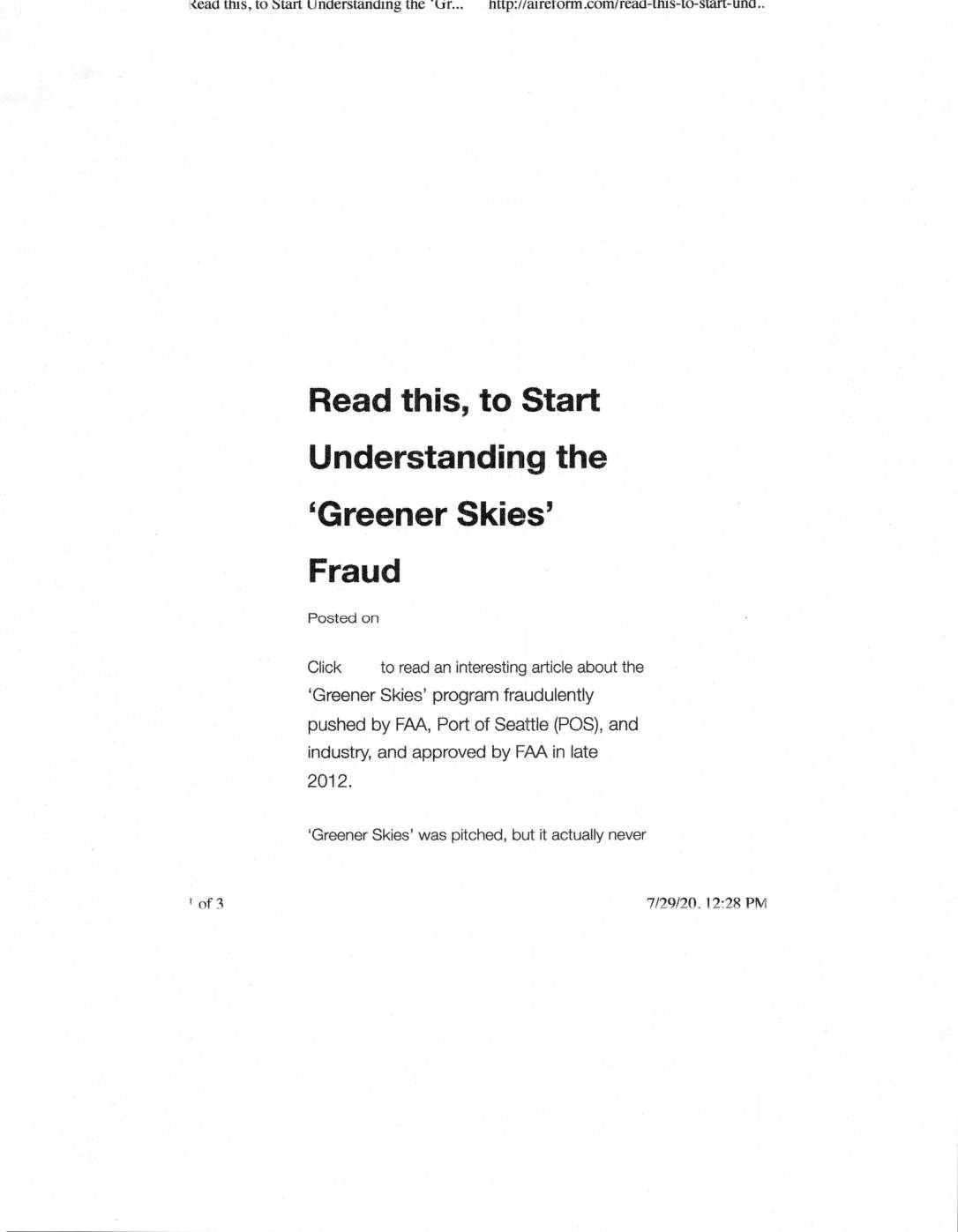 thIS, to start unaerstanclrng tIre 'tir. nttp://alrelorm .corn/reaa-tnls-tustart-una Read this, to Start Understanding the 'Greener Skies’ Fraud Posted on Click to read an interesting article about the 'Greener Skies’ program fraudulently pushed by FAA, Port of Seattle (POS), and industry, and approved by FM in late 201 2. 'Greener Skies’ was pitched, but it actually never of3 7/29/20. 12:28 PM Read thIS, to start unaers tan(IIng tIle 'tir. nttp://alreIorm.com/ 'tnls-t(bstart- una reatly happened. David Suomi (now FAA Regional Administrator) admitted as much when doing his 4/25/2017 $piel for the Port of Seattle Commissioners. Conspicuously, 'Greener Skies’ was focused ONLY on west-side arrivals. Why? Because if FM had tried to create similar concentrated arrival streams over Bellevue, the entire proposal would have been killed by the residents below. 'Greener Skies’ was supposed to bring enormous impact reductions. TIe key design element was to flow more than half of all Sea- Tac arrivals in over Eltiott Bay, miles from horne s, thus with almost no noise impact. Are they doing that, nearly six years later? No, not at all, not even in light traffic, and not even on clear Fall days perfect for flying. Why are the Elliott Bay arrivals so rare? Because the air traffic controllers have to fit all arrivals together, into the final landing flow; i.e., they need to merge both the west flow (especially the HAWKZ arrivals over Vashon Island) and the east flow (the CH INNS downwinds coming up from the southeast entry post near Mt. Rainier,… -