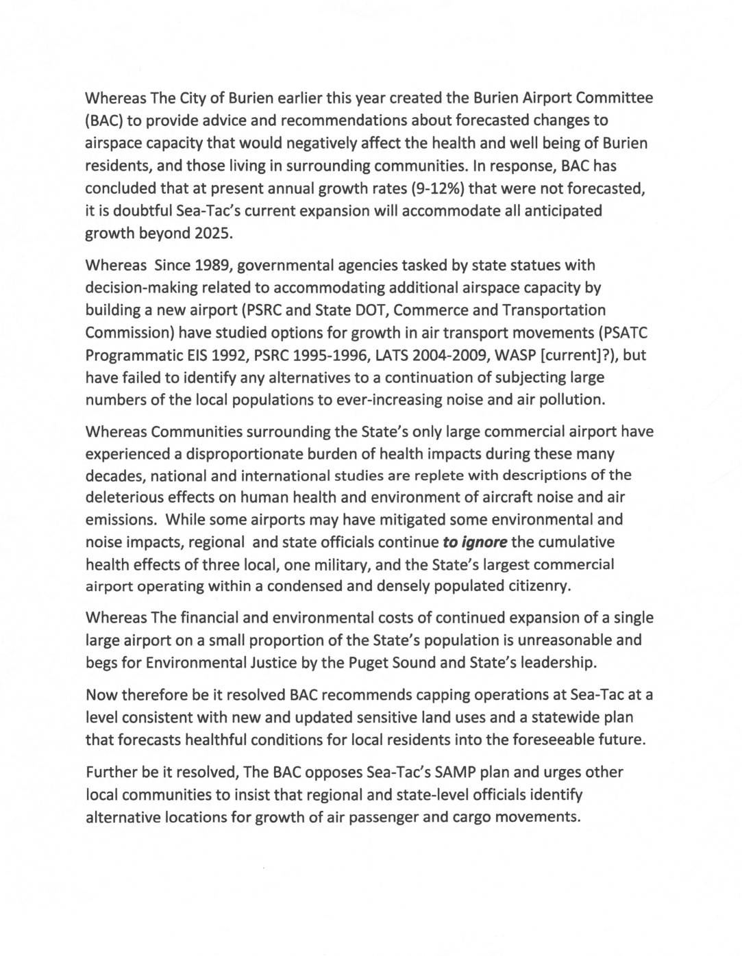 Whereas The City of Burien earlier this year created the Burien Airport Committee (BAC) to provide advice and recommendations about forecasted changes to airspace capacity that would negatively affect the health and well being of Burien residents, and those living in surrounding communities. In response, BAC has concluded that at present annual growth rates (9-12%) that were not forecasted, it is doubtful Sea-Tac’s current expansion will accommodate all anticipated growth beyond 2025. Whereas Since 1989, governmental agencies tasked by state statues with decision-making related to accommodating additional airspace capacity by building a new airport (PSRC and State DOT, Commerce and Transportation Commission) have studied options for growth in air transport movements (PSATC Programmatic EIS 1992, PSRC 1995-1996, LATS 2004-2009, WASP [current]?), but have failed to identify any alternatives to a continuation of subjecting large numbers of the local populations to ever-increasing noise and air pollution. Whereas Communities surrounding the State’s only large commercial airport have experienced a disproportionate burden of health impacts during these many decades, national and international studies are replete with descriptions of the deleterious effects on human health and environment of aircraft noise and air emissions. While some airports may have mitigated some environmental and noise impacts, regional and state officials continue to Ignore the cumulative health effects of three local, one military, and the State’s largest commercial airport operating within a condensed and densely populated citizenry. Whereas The financial and environmental costs of continued expansion of a single large airport on a small proportion of the… -
