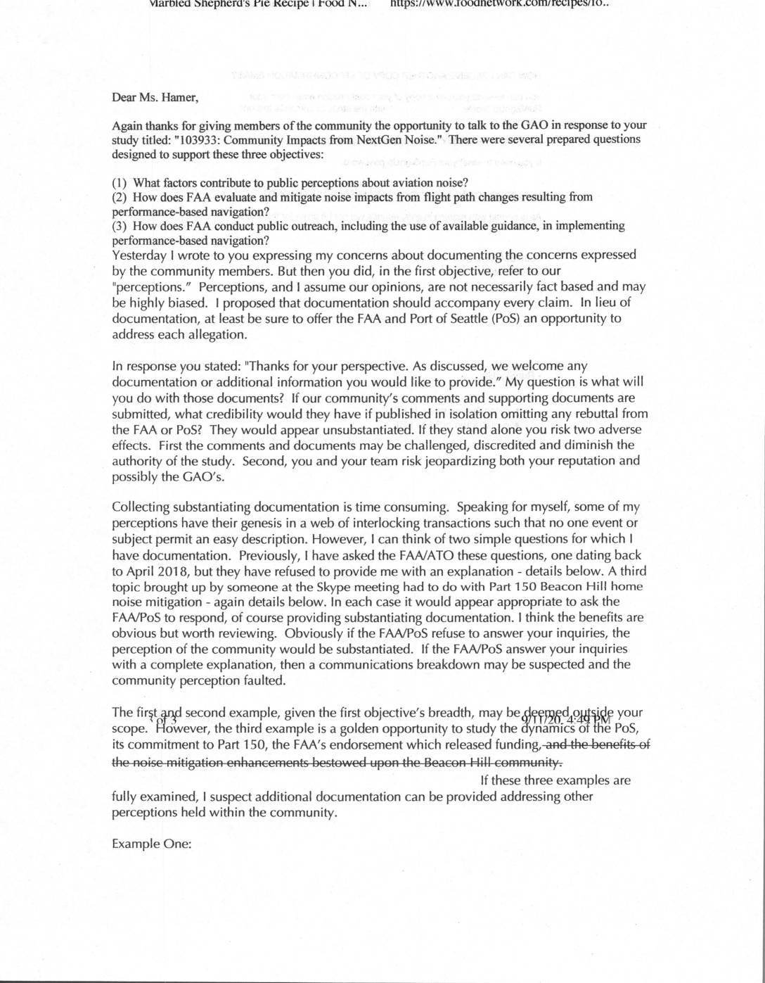 'otea bnel}Hero’s rle ;IDe I roc)a N i mps:// www .iooanetworK.com/ recIpes/10 Dear Ms. Hamer, Again thanks for giving members of the community the opportunity to talk to the GAO in response to Your study titled: " 103933: Community Impacts &om NextGen Noise." There were several prepared questions designed to support these three objectives: (1) What factors contribute to public perceptions about aviation noise? (2) How does FAA evaluate and mitigate noise impacts &om flight path changes resulting from performance-based navigation? (3) How does FAA conduct public outreach, including the use of available guidance, in implementing performance-based navigation? Yesterday I wrote to you expressing my concerns about documenting the concerns expressed by the community members. But then you did, in the first objective, refer to our '’perceptions." Perceptions, and I assume our opinions, are not necessarily fact based and may be highly biased. I proposed that documentation should accompany every claim. In lieu of documentation, at least be sure to offer the FAA and Port of Seattle (PoS) an opportunity to address each allegation. in response you stated: "Thanks for your perspective. As discussed, we welcome any documentation or additional information you would like to prbvide." My question is what will you do with those documents? if our community’s comments and supporting documents are submitted, what credibility would they have if published in isolation omitting any rebuttal from the FAA or PoS? They would appear unsubstantiated. If they stand alone you risk two adverse effects. First the comments and documents… -