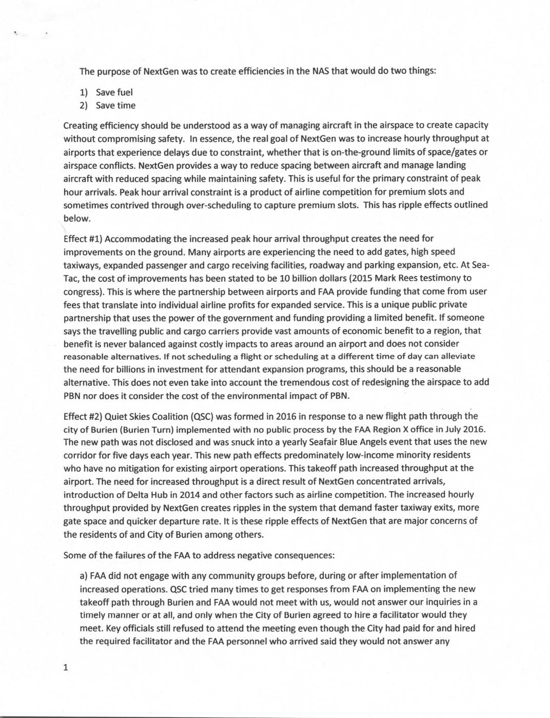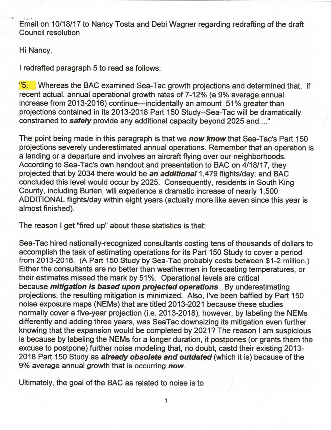 Email on 10/18/17 to Nancy Tosta and Debi Wagner regarding redrafting of the draft Council resolution +_ B Hi Nancy, redrafted paragraph 5 to read as follows: "5. Whereas the BAC examined Sea-Tac growth projections and determined that, recent actual, annual operational growth rates of 7-12% (a 9% average annual increase from 2013-2016) continubincidentally an amount 51% greater than projections contained in its 2013-2018 Part 150 Study–Sea-Tac will be dramatically constrained to safely provide any additional capacity beyond 2025 and...." if The point being made in this paragraph is that we now know that Sea-Tac's Part 150 projections severely underestimated annual operations. Remember that an operation is a landing or a departure and involves an aircraft flying over our neighborhoods. According to Sea-Tac’s own handout and presentation to BAC on 4/18/17, they projected that by 2034 there would be an additional 1 ,479 flights/day; and BAC concluded this level would occur by 2025. Consequently, residents in South King County, including Burien, will experience a dramatic increase of nearly 1,500 ADDITIONAL flights/day within eight years (actually more like seven since this year is almost finished). The reason I get "fired up" at>out these statistics is that: Sea-Tac hired nationally-recognized consultants costing tens of thousands of dollars to accomplish the task of estimating operations for its Part 150 Study to cover a period from 2013-2018. (A Part 150 Study by Sea-Tac probably costs between $1-2 million.) Either the consultants are no better than weathermen in forecasting temperatures, or their estimates missed the… -