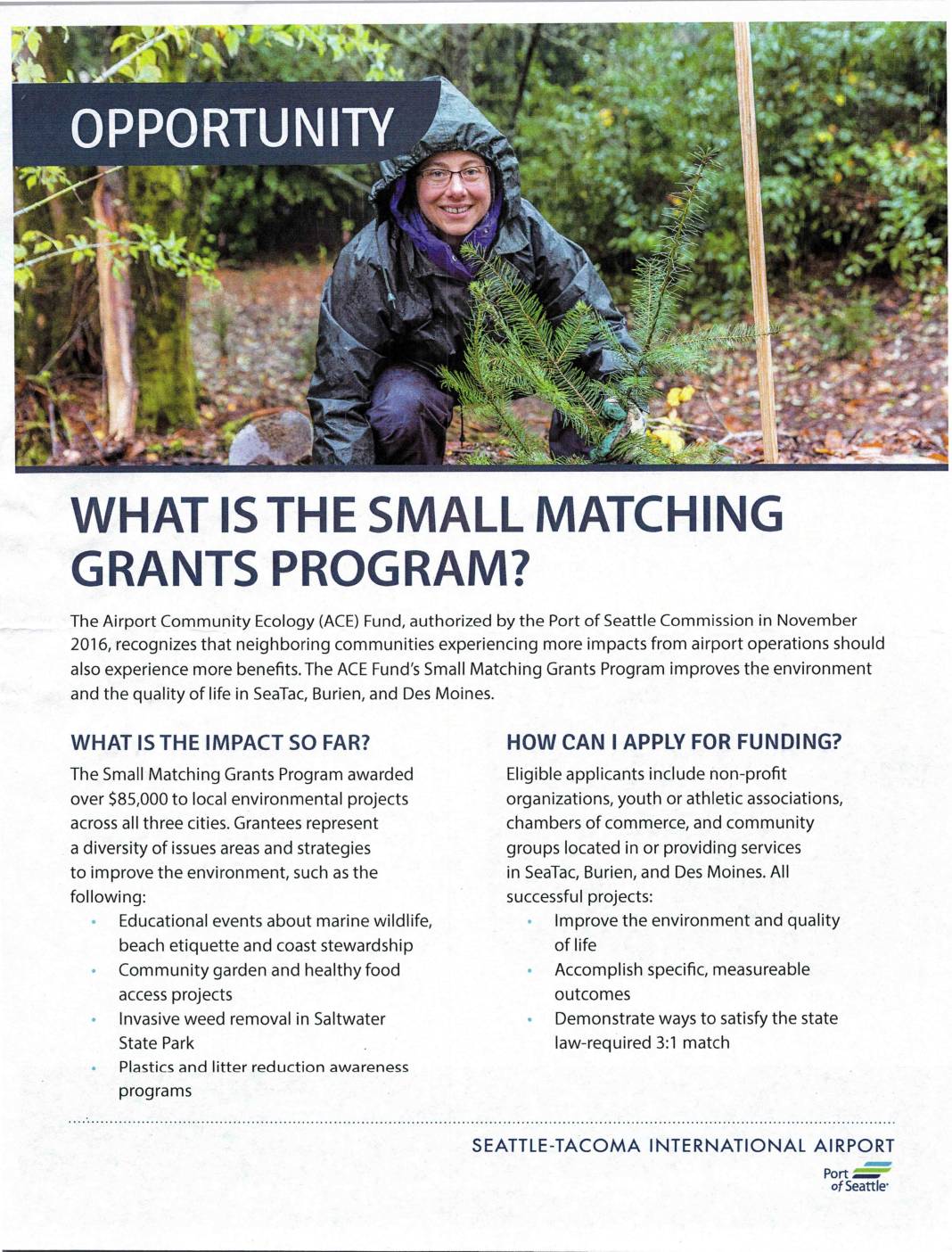 The Airport Community Ecology (ACE) Fund, authorized by the Port of Seattle Commission in November 2016, recognizes that neighboring communities experiencing more impacts from airport operations should also experience more benefits. The ACE Fund’s Small Matching Grants Program improves the environment and the quality of life in SeaTac, Burien, and Des Moines. WHAT IS THE IMPACT SO FAR? HOW CAN I APPLY FOR FUNDING? The Small Matching Grants Program awarded over $85,000 to local environmental projects across all three cities. Grantees represent a diversity of issues areas and strategies to improve the environment, such as the following: Educational events about marine wildlife, beach etiquette and coast stewardship Community garden and healthy food access projects Invasive weed removal in Saltwater State Park Plastics and litter reduction awareness Eligible applicants include non-profit organizations, youth or athletic associations, chambers of commerce, and community groups located in or providing services in SeaTac, Burien, and Des Moines. All successful projects: „ Improve the environment and quality of life „ Accomplish specific, measureable outcomes „ Demonstrate ways to satisfy the state law-required 3:1 match a @ @ ## programs SEATTLE-TACOMA INTERNATIONAL AIRPORT F1)o rHHt //////////rr/1:1 ;H:F : •H ;; / ofSeattle' WHAT IS THE 3:1 MATCH? In accordance with state law, each project must demonstrate a 3 (project) to 1 (Port) match for Port funds awarded. (i.e: For every dollar requested through the grant fund, three dollars of community value must be identi6ed by the applicant.) This match might be a challenge to potential applicants, so… -