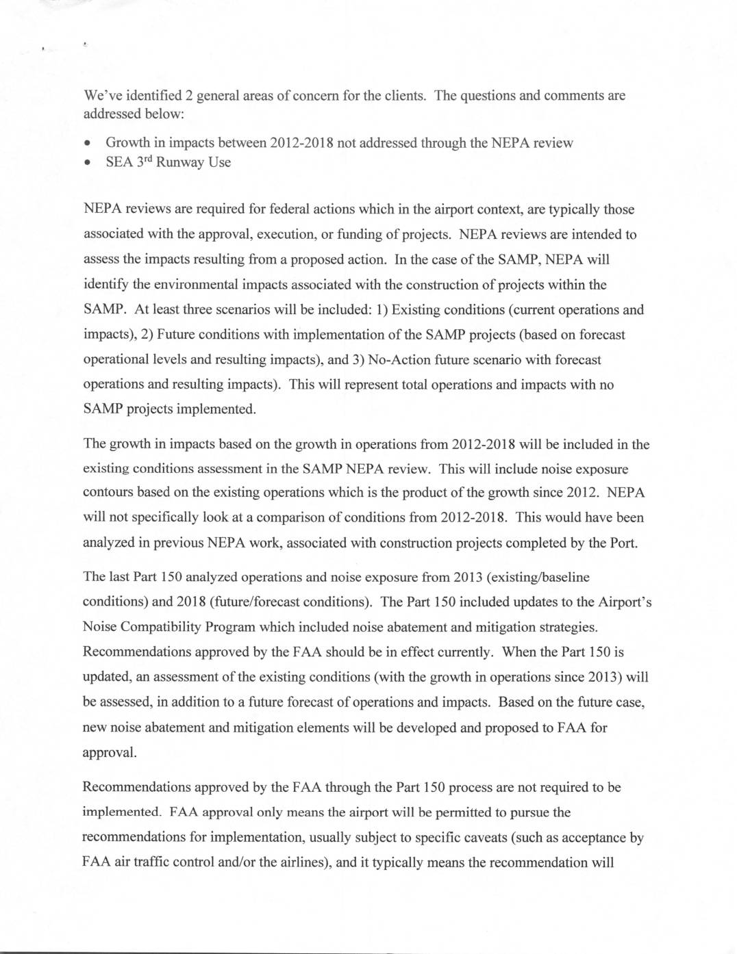 We’ve identified 2 general areas of concern for the clients. The questions and comments are addressed below: Growth in impacts between 2012-2018 not addressed through the NEP A review SEA 3rd Runway Use NEPA reviews are required for federal actions which in the airport context, are typically those associated with the approval, execution, or funding of projects. NEPA reviews are intended to assess the impacts resulting from a proposed action. In the case of the SAMP, NEPA will identify the environmental impacts associated with the construction of projects within the S AMP. At least three scenarios will be included: 1) Existing conditions (current operations and impacts), 2) Future conditions with implementation of the S AMP projects (based on forecast operational levels and resulting impacts), and 3) No-'.Action future scenario with forecast operations and resulting impacts). This will represent total operations and impacts with no S AMP projects implemented. The growth in impacts based on the growth in operations from 2012-2018 will be included in the existing conditions assessment in the S AMP NEPA review. This will include noise exposure contours based on the existing operations which is the product of the growth since 2012. NEP A will not specifically look at a comparison of conditions from 2012-2018. This would have been analyzed in previous NEPA work, associated with construction projects completed by the Port. The last Part 150 analyzed operations and noise exposure from 2013 (existing/baseline conditions) and 2018 (future/forecast conditions). The Part 150 included updates to the Airport’s Noise… -