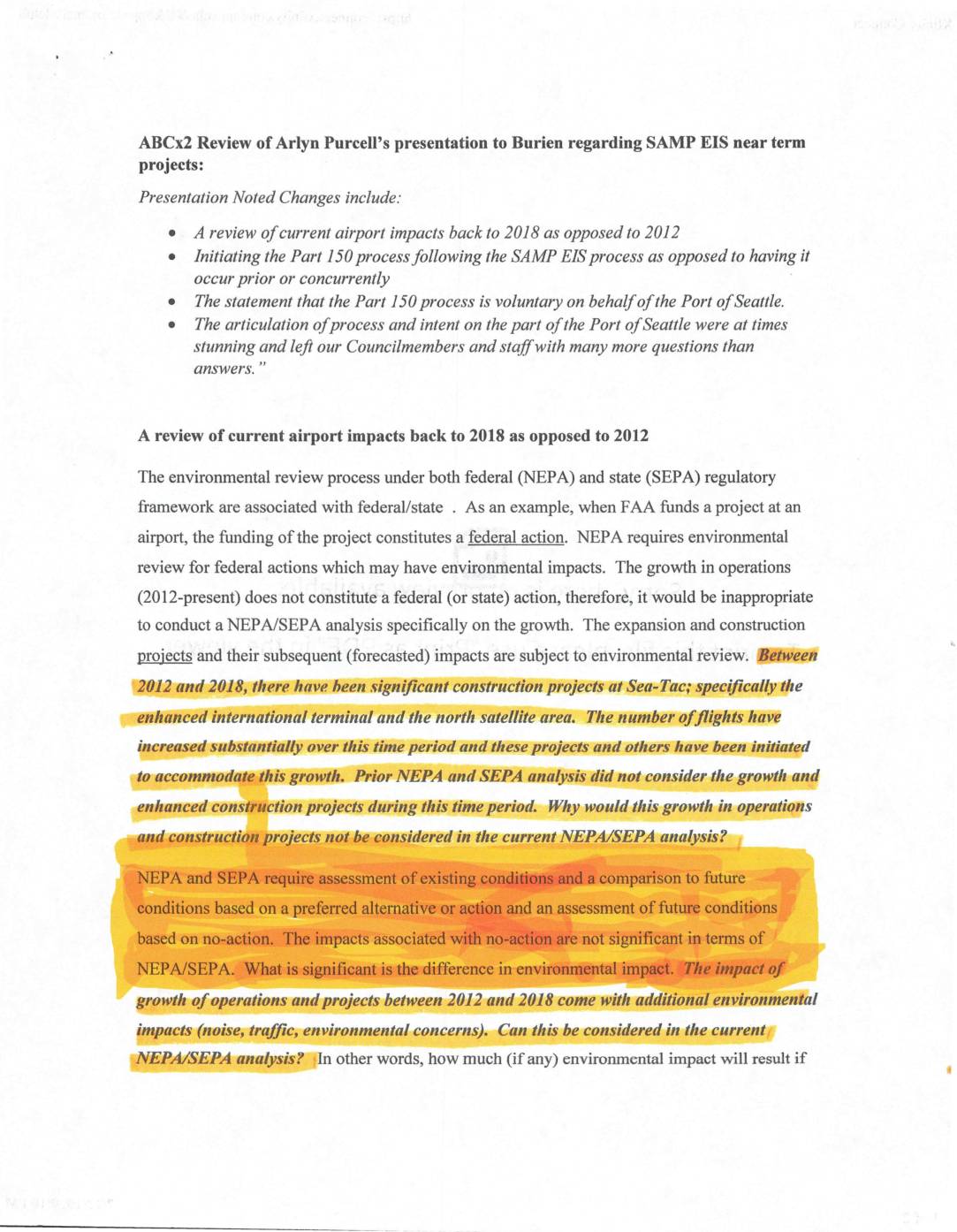 ABCx2 Review of Arlyn Purcell’s presentation to Burien regarding SAMP EIS near term projects: Presentation Noted Changes include. B A review ofcurrent airport impacts back to 2018 as opposed to 2012 ' Initiating the Part 150 process following the SAMP EIS process as opposed to having it occur prior or concurrently ' The statement that the Part 150 process is voluntary on behalfofthe Port ofSeattle. ' The articulation of process and intent on the part of the Port of Seattle were at times stunning and left our Councitmembers and staff with many more questions than answers . A review of current airport impacts back to 2018 as opposed to 2012 The environrnental review process under both federal (NEPA) and state (SEPA) regulatory framework are associated with federal/state . As an example, when FAA funds a project at an airport, the funding of the project constitutes a federal action. NEP A requires environmental review for federal actions which may have environmental impacts. The growth in operations (2012-present) does not constitute a federal (or state) action, therefore, it would be inappropriate to conduct a NEP A/SEPA analysis specifically on the growth. The expansion and construction projects and their subsequent (forecasted) impacts are subject to environmental review. Between 2012 and 2018, there have been significant construction projects at Sea-Tac; speci.neatly the enhanced international termiaal and the north satellite area. The number of flights have increased substantially over this time period and these projects and others have been initiated to accowtmodate this growth. Prior… -