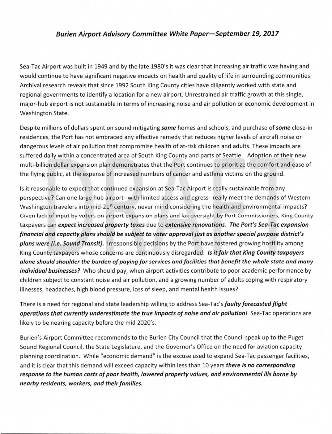 Burien Airport Advisory Committee White Paper–September 19, 2017 Sea-Tac Airport was built in 1949 and by the late 1980’s it was clear that increasing air traffic was having and would continue to have significant negative impacts on health and quality of life in surrounding communities. Archival research reveals that since 1992 South King County cities have diligently worked with state and regional governments to identify a location for a new airport. Unrestrained air traffic growth at this single, major-hub airport is not sustainable in terms of increasing noise and air pollution or economic development in Washington State. Despite millions of dollars spent on sound mitigating some homes and schools, and purchase of some close-in residences, the Port has not embraced any effective remedy that reduces higher levels of aircraft noise or dangerous levels of air pollution that compromise health of at-risk children and adults. These impacts are suffered daily within a concentrated area of South King County and parts of Seattle. Adoption of their new multi-billion dollar expansion plan demonstrates that the Port continues to prioritize the comfort and ease of the flying public, at the expense of increased numbers of cancer and asthma victims on the ground. g Is it reasonable to expect that continued expansion at Sea-Tac Airport is really sustainable from any perspective? Can one large hub airport--with limited access and egress--really meet the demands of Western Washington travelers into mid-21st century, never mind considering the health and environmental impacts? Given lack of input by voters on… -