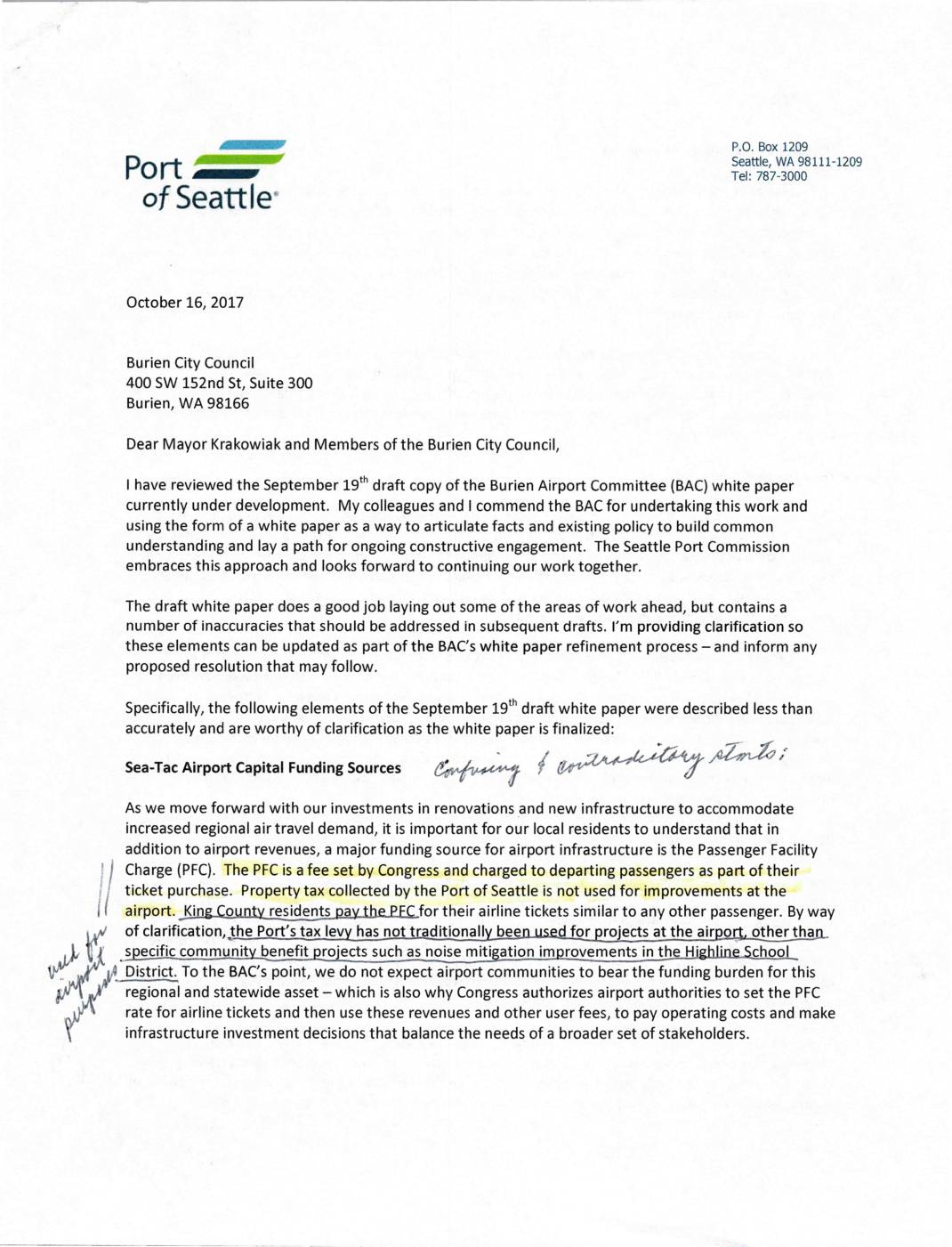 Dear Mayor Krakowiak and Members of the Burien City Council, have reviewed the September 19th draft copy of the Burien Airport Committee (BAC) white paper currently under development. My colleagues and I commend the BAC for undertaking this work and using the form of a white paper as a way to articulate facts and existing policy to build common understanding and lay a path for ongoing constructive engagement. The Seattle Port Commission embraces this approach and looks forward to continuing our work together. The draft white paper does a good job laying out some of the areas of work ahead, but contains a number of inaccuracies that should be addressed in subsequent drafts. I’m providing clarification so these elements can be updated as part of the BAC’s white paper refinement process – and inform any proposed resolution that may follow. Specifically, the following elements of the September 19th draft white paper were described less than accurately and are worthy of clarification as the white paper is finalized: Sea-Tac Airport Capital Funding Sources As we move forward with our investments in renovations and new infrastructure to accommodate increased regional air travel demand, it is important for our local residents to understand that in addition to airport revenues, a major funding source for airport infrastructure is the Passenger Facility Charge (PFC). The PFC is a fee set by Congress and charged to departing passengers as part of their ticket purchase. Property tax collected by the Port of Seattle is not used for… -