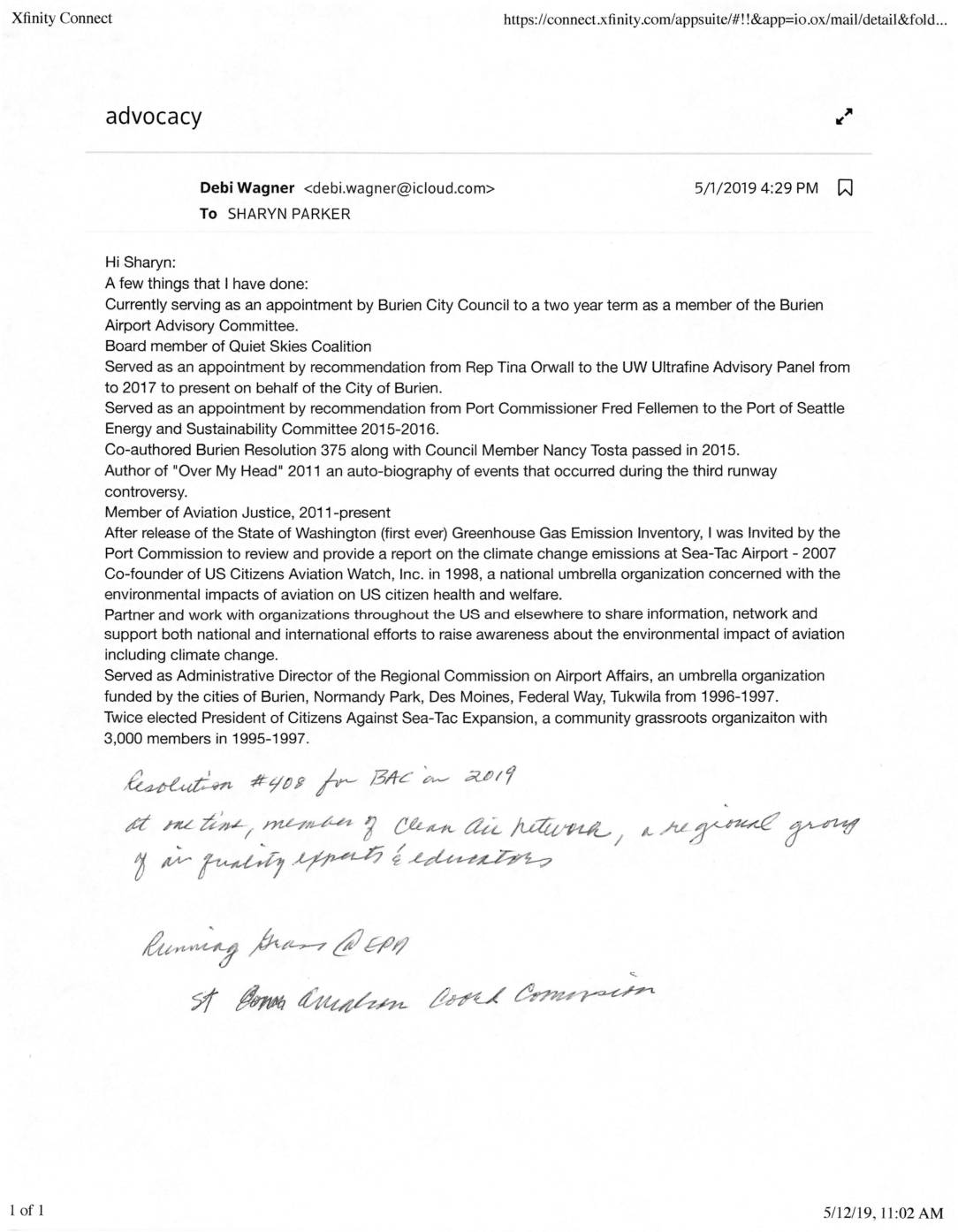 A few things that I have done: Currently serving as an appointment by Burien City Council to a two year term as a member of the Bullen Airport Advisory Committee. Board member of Quiet Skies Coalition Served as an appointment by recommendation from Rep Tina Orwall to the UW Ultrafine Advisory Panel from to 201 7 to present on behalf of the City of Burien. Served as an appointment by recommendation from Port Commissioner Fred Fellemen to the Port of Seattle Energy and Sustainability Committee 201 5-2016. Co-authored Burien Resolution 375 along with Council Member Nancy Tosta passed in 2015. Author of "Over My Head" 201 1 an auto-biography of events that occurred during the third runway controversy. Member of Aviation Justice, 201 1 -present After release of the State of Washington (first ever) Greenhouse Gas Emission Inventory, I was Invited by the Port Commission to review and provide a report on the climate change emissions at Sea-Tac Airport - 2007 Co-founder of US Citizens Aviation Watch, Inc. in 1998, a national umbrella organization concerned with the environmental impacts of aviation on US citizen health and welfare. Partner and work with organizations throughout the US and elsewhere to share information, network and support both national and international efforts to raise awareness about the environmental impact of aviation including climate change. Served as Administrative Director of the Regional Commission on Airport Affairs, an umbrella organization funded by the cities of Burien, Normandy Park, Des Moines, Federal Way, Tukwi Ia from 1996-1… -