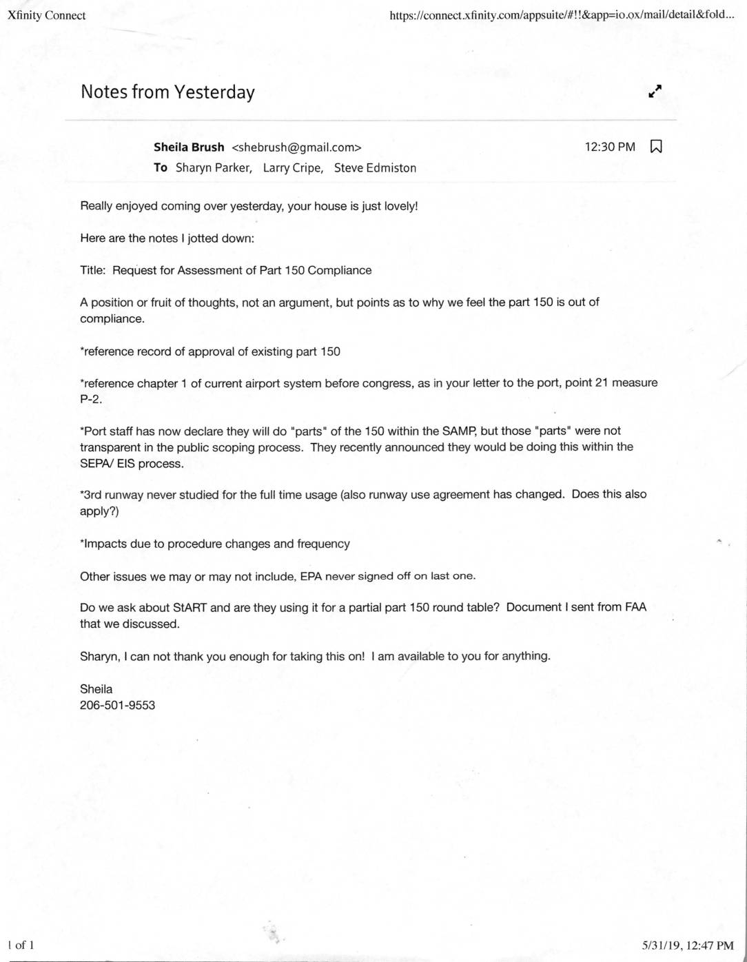 Really enjoyed coming over yesterday, your house is just lovely! ;• Here are the notes I jotted down: Title: Request for Assessment of Part 150 Compliance A position or fruit of thoughts, not an argument, but points as to why we feel the part 150 is out of compliance. *reference record of approval of existing part 150 *reference chapter 1 of current airport system before congress, as in your letter to the port, point 21 measure P-2 *Port staff has now declare they will do "parts" of the 150 within the SAMP, but those "parts" were not transparent in the public scoping process. They recently announced they would be doing this within the SEPA/ EIS process. *3rd runway never studied for the full time usage (also runway use agreement has changed. Does this also apply?) *Impacts due to procedure changes and frequency .Qb Other issues we may or may not include, EPA never signed off or1 last one. Do we ask about StART and are they using it for a partial part 150 round table? Document I sent from FAA that we discussed Shawn, I can not thank you enough for taking this on! I am available to you for anything. Sheila 206-501 -9553 of 5/31/19, 12:47 PM -