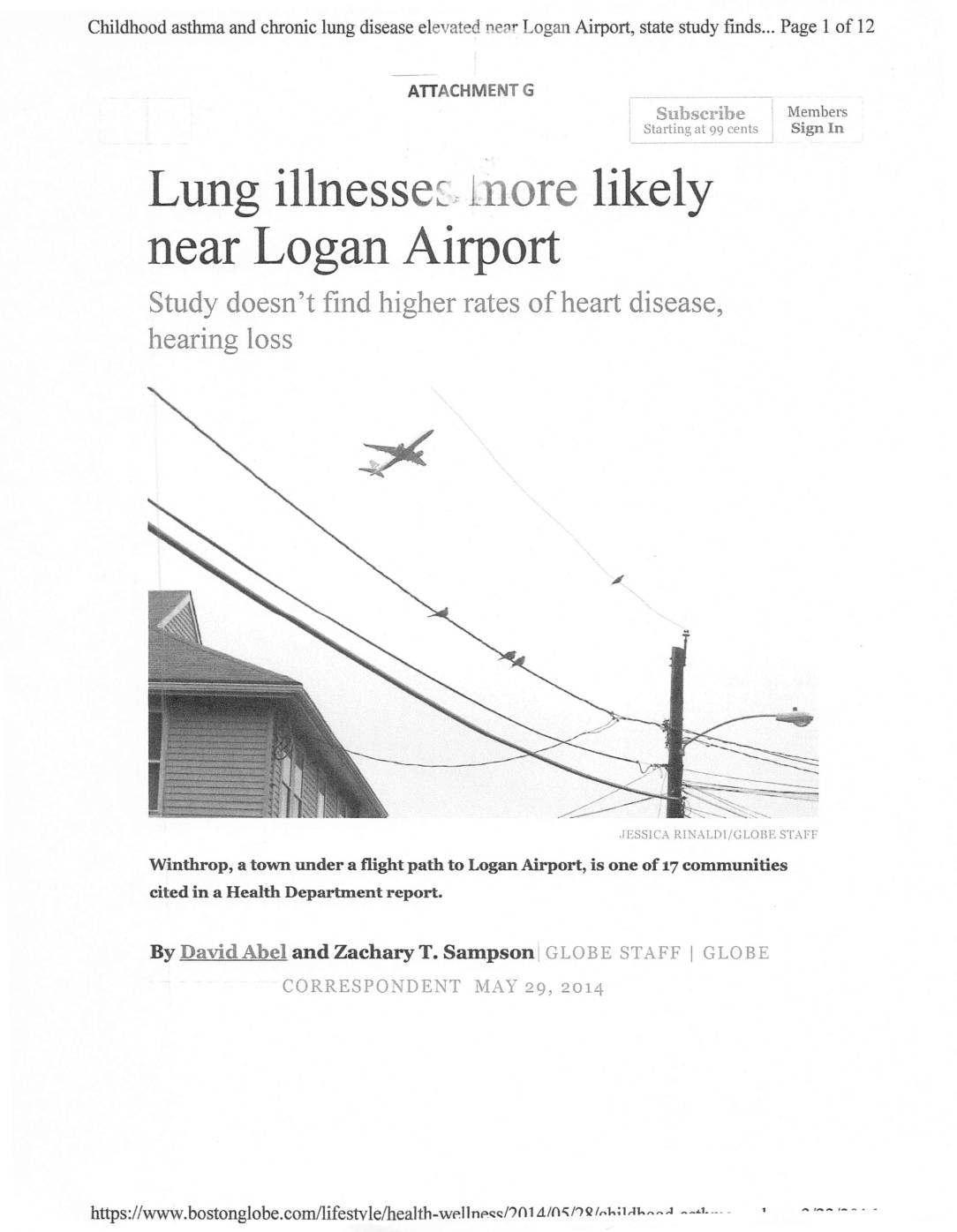 Childhood asthma and chronic lung disease elevated near Logan Airport, state study finds... Page 1 of 12 ATTACHMENT G Subscribe ; Members Starting at 99 cents , Sign in b illnesse: Lnore Airport Study (loesn’t find higher rates of heart disease, hearing loss nea FiESSICA RiNALDI /GLOBE STAFF one of 17 communitiesYWnthrop, cited in a Health under a flight path to Depi Lent report By David Abel and Zachary T. Sampson GLOBE STAFF ! GLOBE CORRESPONDENT MAY 29, 20r4 https://www.bostonglobe.com/lifestyje/health-.wellnpqq/':>QI 4/nq/IQ/"h:14-’'’- ' ,nH,4l_ _- - - I a tAn Childhood asthma and chronic lung disease elevated near Logan Airport, state study finds... Page 2 of 12 Children who live in neighborhoods bordering Logan International Airport are as much as four times more likely to wheeze, experience shortness of breath, and exhibit other signs of undiagnosed asthma compared with children who live farther away, according to a Lew awaited state report released Wednesday night. The study, commissioned by the Legislature 14 years ago and only now 6nished, also found that adults who have lived near the airport for three or more years – in parts of East Boston, South Boston, Chelsea, and Winthrop – are nearly twice as likely to experience chronic obstructive pulmonary disease than those living in communities with less exposure to air pollution from planes taking off and landing. But the $1.8 million study by the state Department of Public Health, which was delayed after going years without hrnding and after five revisions to its complicated statistical models,… -