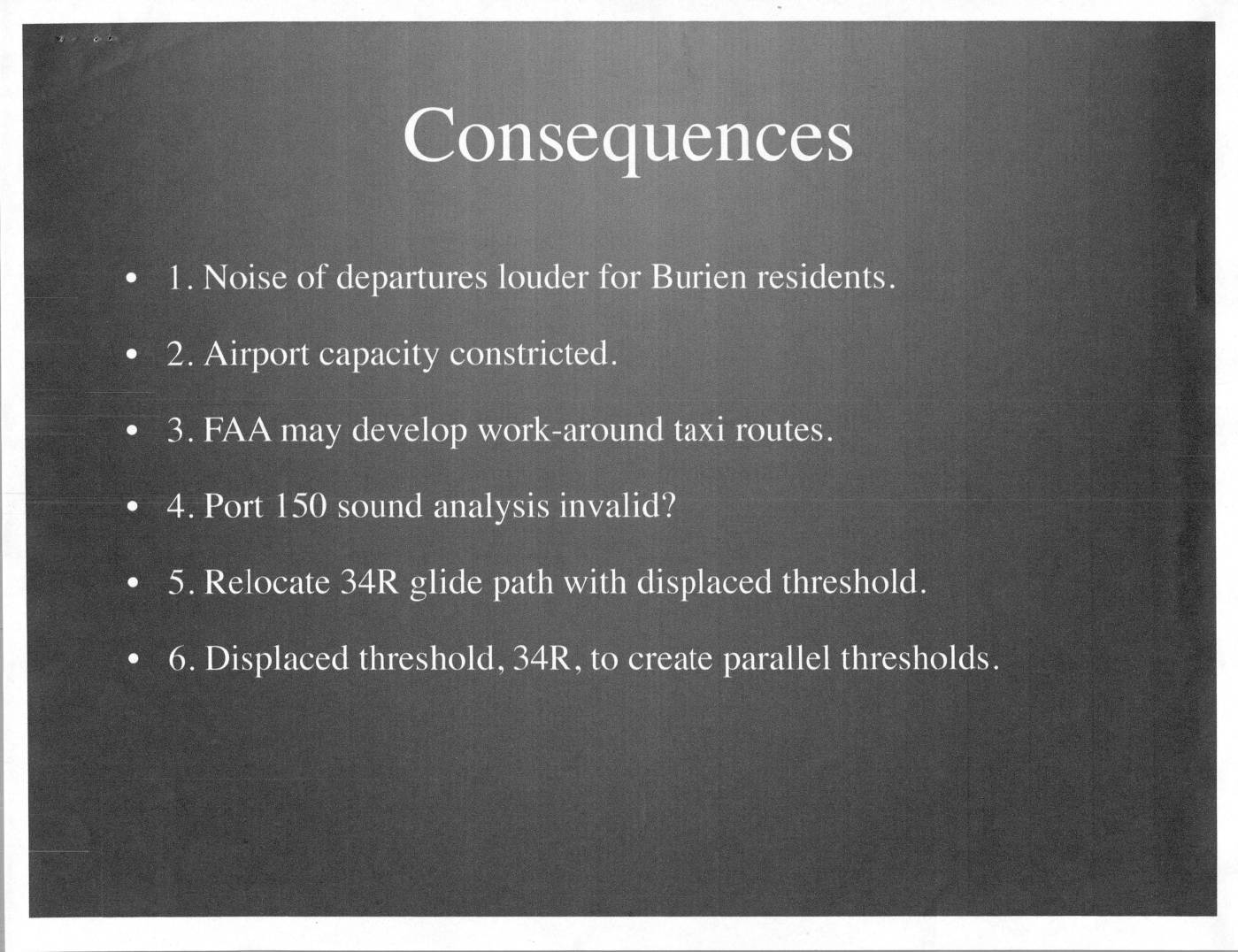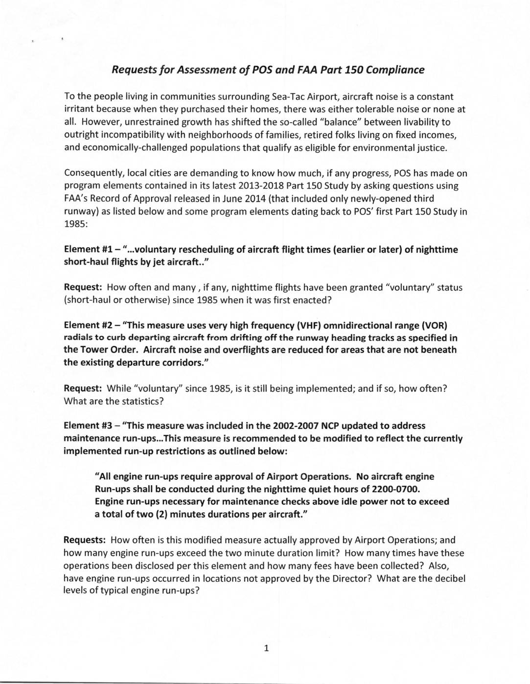 Requests for Assessment of POS and FAA Part 150 Compliance To the people living in communities surrounding Sea-Tac Airport, aircraft noise is a constant irritant because when they purchased their homes, there was either tolerable noise or none at all. However, unrestrained growth has shifted the so-called “balance” between livability to outright incompatibility with neighborhoods of families, retired folks living on fixed incomes, and economically-challenged populations that qualify as eligible for environmental justice. Consequently, local cities are demanding to know how much, if any progress, POS has made on program elements contained in its latest 2013-2018 Part 150 Study by asking questions using FAA’s Record of Approval released in June 2014 (that included only newly-opened third runway) as listed below and some program elements dating back to POS’ first Part 150 Study in 1985 Element #1 - “...voluntary rescheduling of aircraft flight times (earlier or later) of nighttime short-haul flights by jet aircraft.." Request: How often and many , if any, nighttime flights have been granted “voluntary” status (short-haul or otherwise) since 1985 when it was first enacted? Element #2 – “This measure uses very high frequency (VHF) omnidirectional range (VOR) radials to curb departing aircraft from drifting off the runway heading tracks as specified in the Tower Order. Aircraft noise and oveNlights are reduced for areas that are not beneath the existing departure corridors.” Request: While “voluntary” since 1985, is it still being implemented; and if so, how often? What are the statistics? Element #3 - “This measure was… -