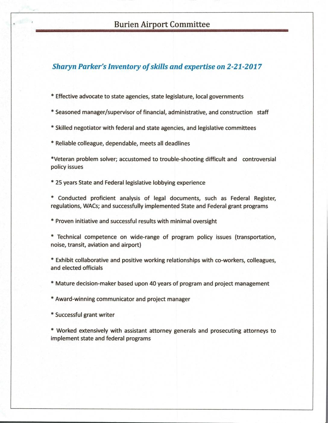 Sharyn Parker’s Inventory of skills and expertise on 2-21-2017 * Effective advocate to state agencies, state legislature, local governments * Seasoned manager/supervisor of financial, administrative, and construction staff * Skilled negotiator with federal and state agencies, and legislative committees * Reliable colleague, dependable, meets all deadlines *Veteran problem solver; accustomed to trouble-shooting difficult and controversial policy issues * 25 years State and Federal legislative lobbying experience * Conducted proficient analysis of legal documents, such as Federal Register, regulations, WACs; and successfully implemented State and Federal grant programs * Proven initiative and successful results with minimal oversight * Technical competence on wide-range of program policy issues (transportation, noise, transit, aviation and airport) * Exhibit collaborative and positive working relationships with co-workers, colleagues, and elected officials * Mature decision-maker based upon 40 years of program and project management * Award-winning communicator and project manager * Successful grant writer * Worked extensively with assistant attorney generals and prosecuting attorneys to implement state and federal programs Patent:ai Agenda Topics for Discussion by the BuRen Airp©r{ C©n3wittee NAME: &d&. % ( L I& y ! ! i i ?}} ;! !{ > Piease check if yau have know iedge in this topic and are willing to devote time to work on it Topic ! Description Law : Med ! High mopaeiF;}= issues facing Baden due to airport proxirnity {e.g., noise, pollution traffic) and key negative impacts on the coninlunity Deve lob :-i;;- itf others facing cha!!enge s due to airport opefat:;an s, including other cities,… -