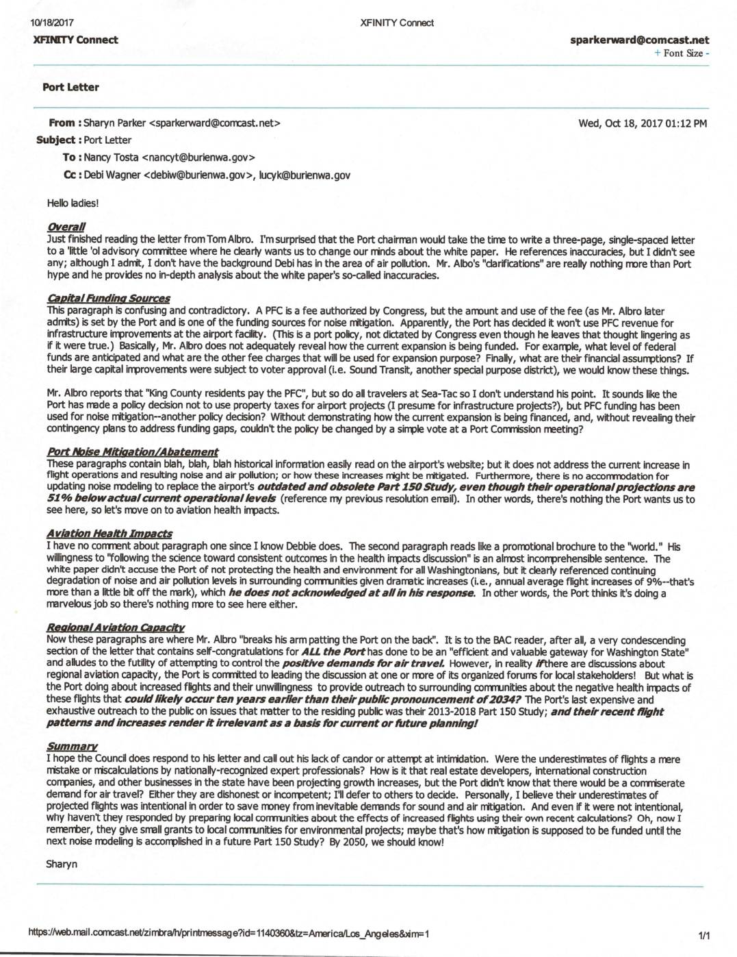 BAC SP #2 Sharyn Parker To Nancy Tosta Re Letter From Port Commission President Tom Albro 20171018 0001