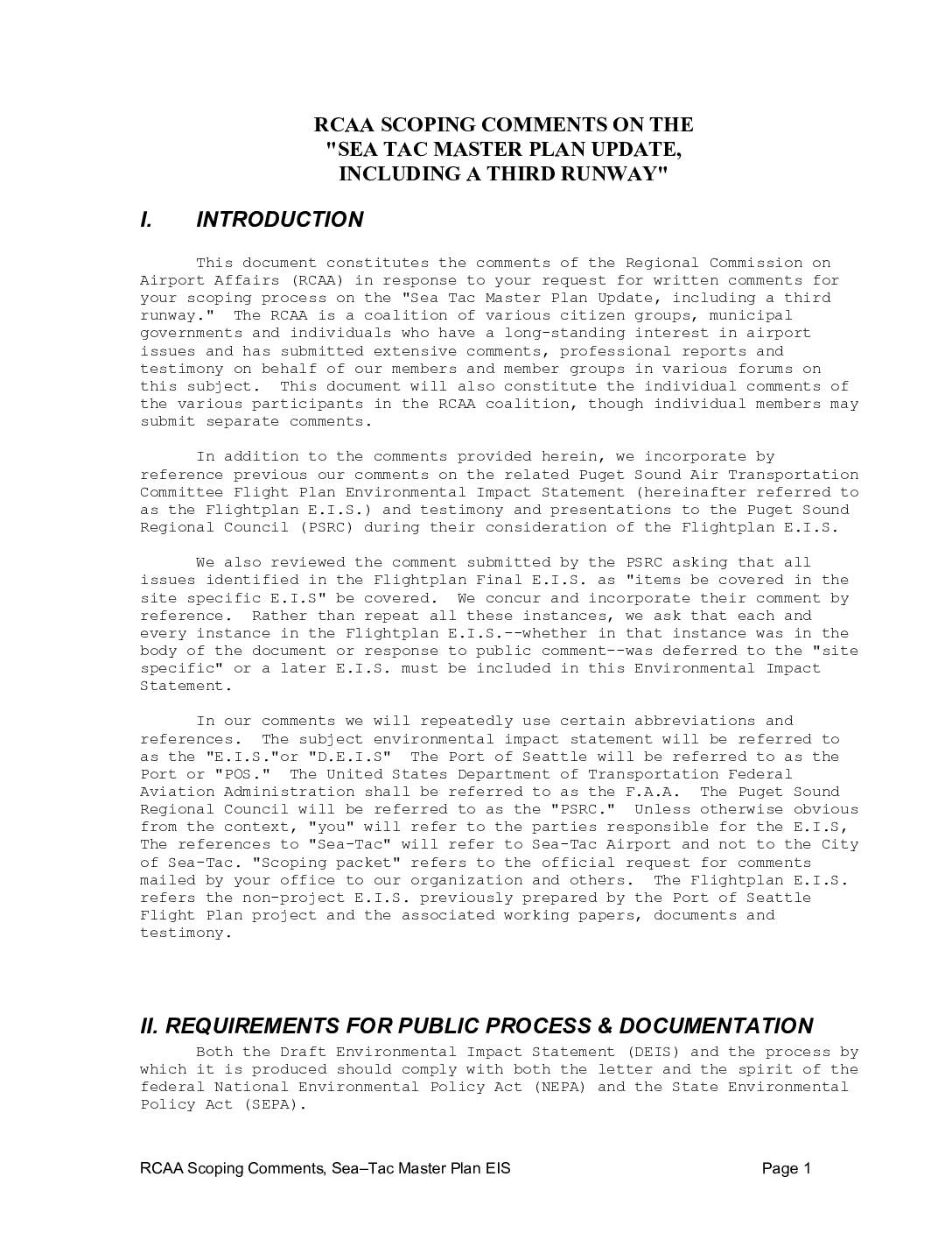 This document constitutes the comments of the Regional Commission on Airport Affairs (RCAA) in response to your request for written comments for your scoping process on the "Sea Tac Master Plan Update, including a third runway." The RCAA is a coalition of various citizen groups, municipal governments and individuals who have a long-standing interest in airport issues and has submitted extensive comments, professional reports and testimony on behalf of our members and member groups in various forums on this subject. This document will also constitute the individual comments of the various participants in the RCAA coalition, though individual members may submit separate comments. In addition to the comments provided herein, we incorporate by reference previous our comments on the related Puget Sound Air Transportation Committee Flight Plan Environmental Impact Statement (hereinafter referred to as the Flightplan E.I.S.) and testimony and presentations to the Puget Sound Regional Council (PSRC) during their consideration of the Flightplan E.I.S. We also reviewed the comment submitted by the PSRC asking that all issues identified in the Flightplan Final E.I.S. as "items be covered in the site specific E.I.S" be covered. We concur and incorporate their comment by reference. Rather than repeat all these instances, we ask that each and every instance in the Flightplan E.I.S.--whether in that instance was in the body of the document or response to public comment--was deferred to the "site specific" or a later E.I.S. must be included in this Environmental Impact Statement. In our comments we will repeatedly use certain…