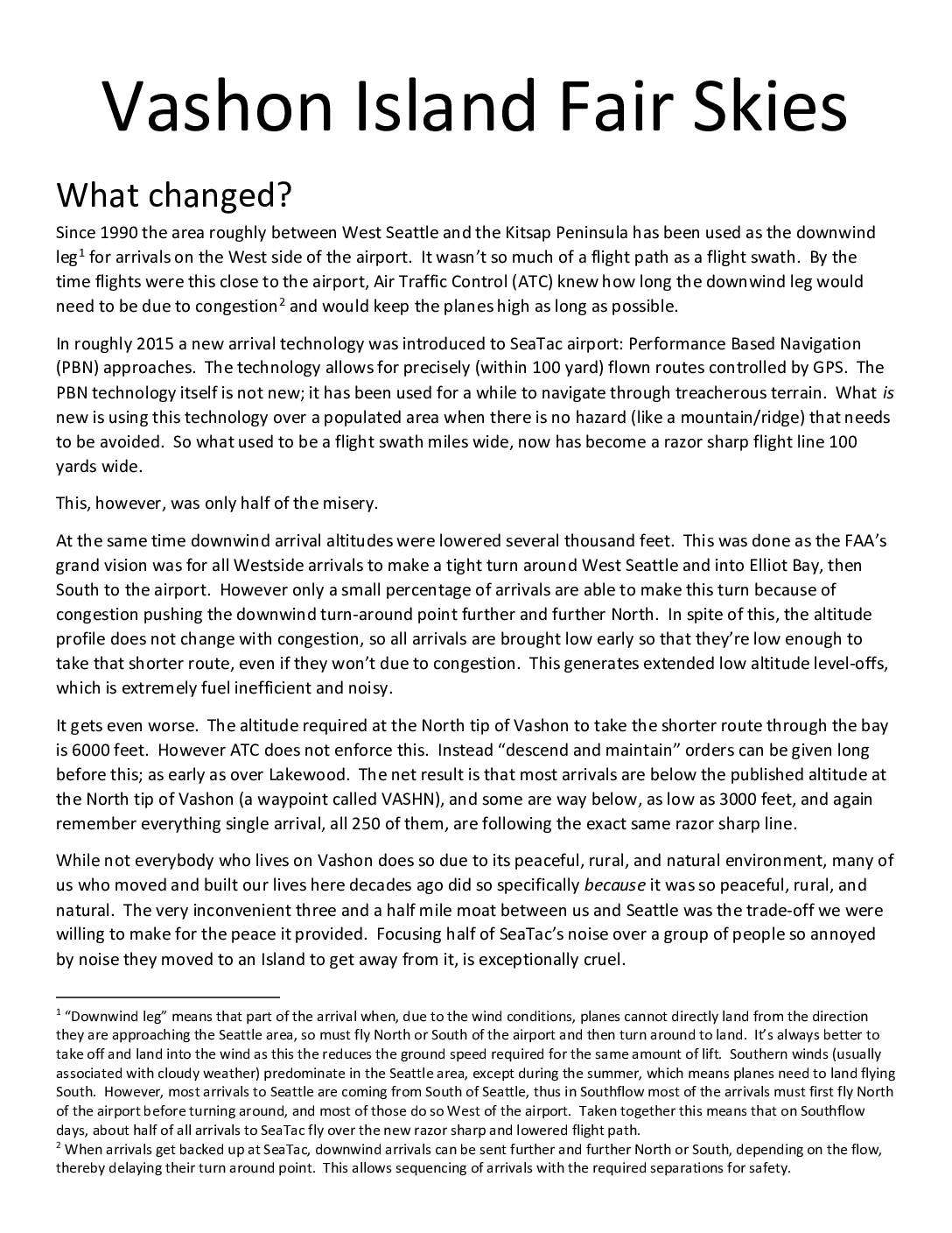 A document explaining changes to aircraft arrival patterns at SeaTac airport around 2015, including the introduction of Performance Based Navigation (PBN) technology and lowered flight altitudes. The changes concentrated flight paths over Vashon Island in a narrow corridor, causing increased noise pollution for residents who chose to live there for its peaceful environment.