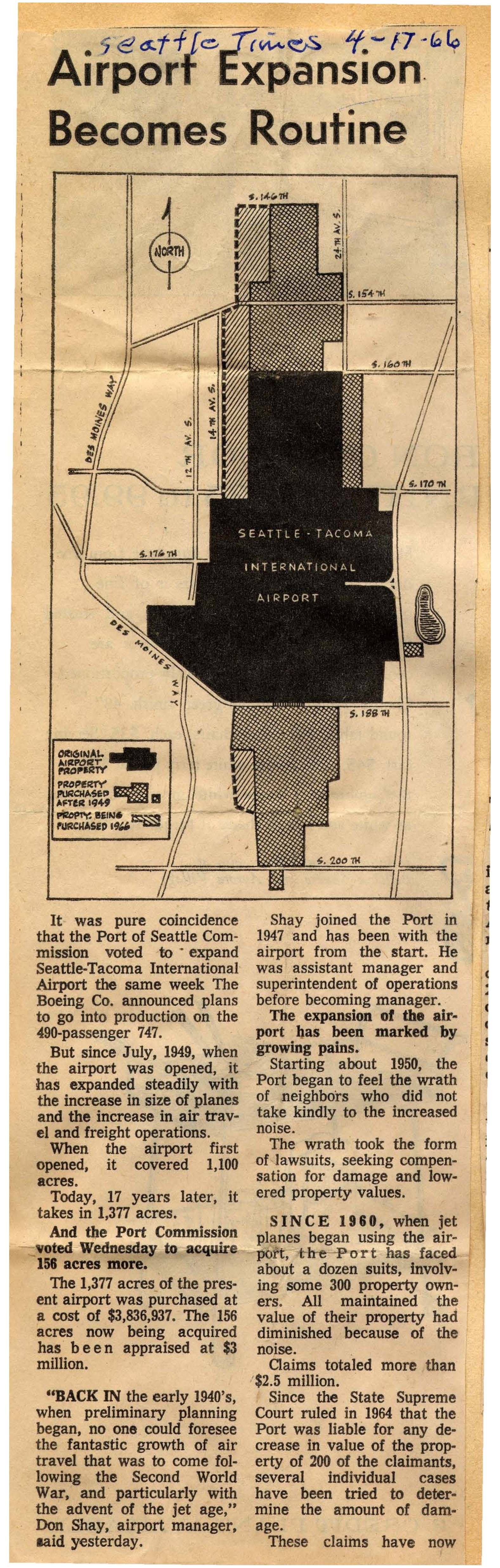 has b e en appraised at $3 million. ; -, .... ...-- outine f. tA.t;'lH ' ' 'I "> -< ~ f.'""""' Shay joined the Port in 1947 and has been with the airport from the start. He was assistant manager and superintendent of operations before becoming manager . . The expansion of the air- port has been marked by • • growtng .pams., · Starting about 1950, the Port began to feel the wrath of neighbors who did not take kindly t~ the increased noise. The wrath took the form of lawsuits, seeking compen- sation for damage and low- ered property values. SINCE 1960, when jet planes began using the air- port, - the ·Port has faced about a dozen suits, involv- ing some 300 property own- ers. All maintained the value of their property had diminished because of the noise. . Claims totaled more than '$2.5 million. ,, ~ ' • - r ,( f c • • • c c "BACK IN the early 1940's, when preliminary planning began, no one could foresee the fantastic growth of air travel that was to come fol- lowing the Second World War, and· particularly with the advent of the jet age," Don Shay, airport manager, laid yesterday. Since the State Supreme 1 Court ruled in 1964 that the · Port was liable for any de- crease in value of the prop- erty of 200 of the claimants, several individual cases , have been tried to deter- mine the amount of…