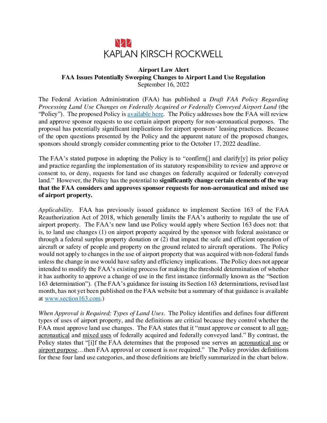 FAA Issues Potentially Sweeping Changes to Airport Land Use Regulation September 16, 2022 The Federal Aviation Administration (FAA) has published a Draft FAA Policy Regarding Processing Land Use Changes on Federally Acquired or Federally Conveyed Airport Land (the “Policy”). The proposed Policy is available here. The Policy addresses how the FAA will review and approve sponsor requests to use certain airport property for non-aeronautical purposes. The proposal has potentially significant implications for airport sponsors’ leasing practices. Because of the open questions presented by the Policy and the apparent nature of the proposed changes, sponsors should strongly consider commenting prior to the October 17, 2022 deadline. The FAA’s stated purpose in adopting the Policy is to “confirm[] and clarify[y] its prior policy and practice regarding the implementation of its statutory responsibility to review and approve or consent to, or deny, requests for land use changes on federally acquired or federally conveyed land.” However, the Policy has the potential to significantly change certain elements of the way that the FAA considers and approves sponsor requests for non-aeronautical and mixed use of airport property. Applicability. FAA has previously issued guidance to implement Section 163 of the FAA Reauthorization Act of 2018, which generally limits the FAA’s authority to regulate the use of airport property. The FAA’s new land use Policy would apply where Section 163 does not: that is, to land use changes (1) on airport property acquired by the sponsor with federal assistance or through a federal surplus property donation or (2)…