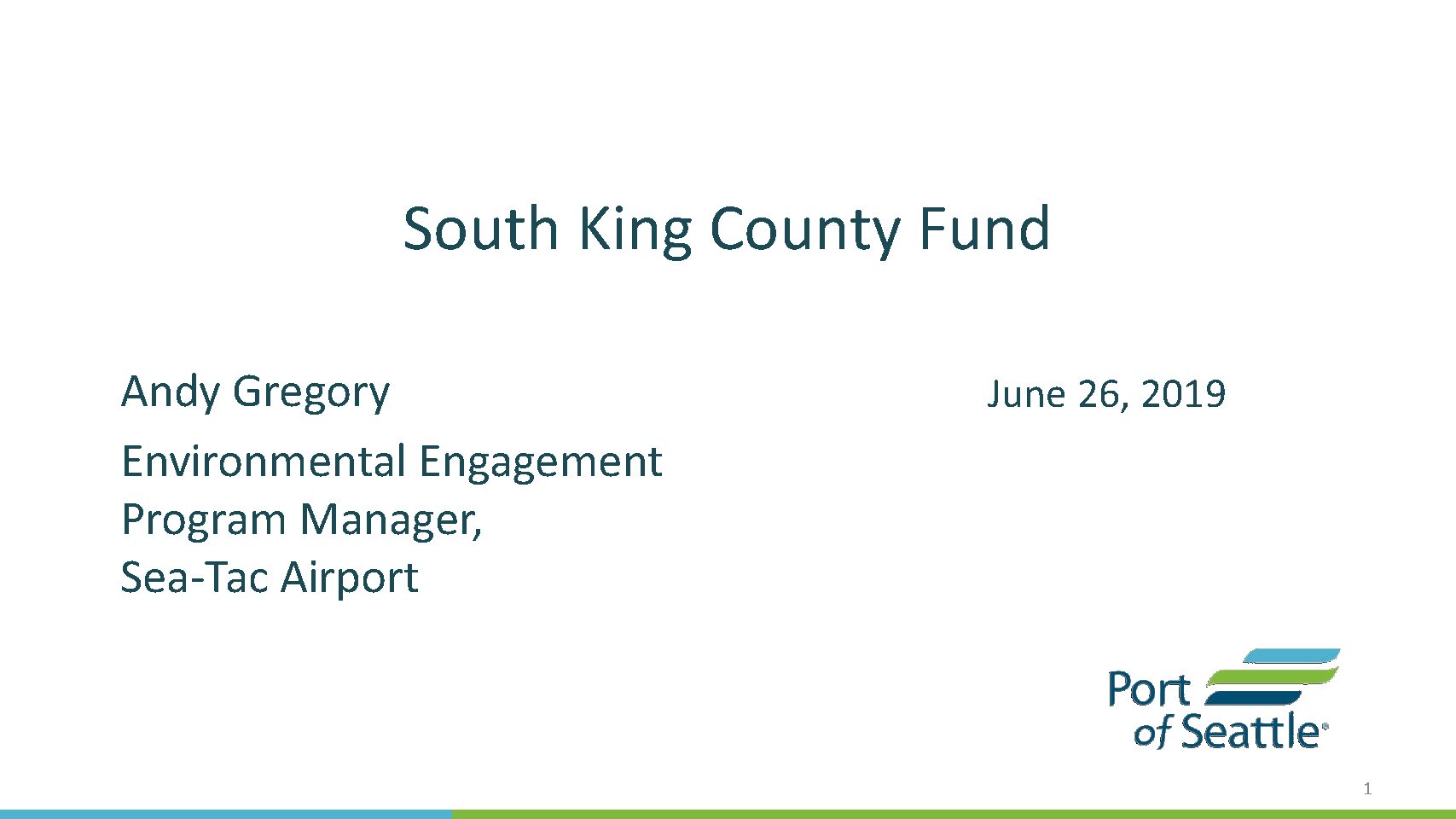 • Provide context for spending within the Port’s statutory authority. • Present the outreach plan. • Allow some time for Q&A. Origin of the South King County Fund On November 27, 2018, Port Commission passed a motion creating the SKCF as follows: “There shall be an Airport Community Fund, which will designate $750,000 in 2019 to be used to provide airport communities resources and support, as allowed under law. Additional funding shall be designated for the Airport Community Fund over five years not to exceed a gross allocation of $10 million between 2019 and 2023, inclusive.” Commission-Adopted Principles (1 of 2) • The SKCF will be used to fund projects in the South King County area: Defined as near-airport communities, with other locations considered on a case-by-case basis, depending on the merits and type of program or project. • The SKCF will prioritize community input to inform Port decision making: Recognizes the importance of community participation and the Port governance role. • The SCKF will support Port equity policies and practices: Gives underrepresented communities access to opportunities, and uses equity policies to evaluate potential initiatives and establish desired outcomes. • The SKCF will provide added benefit: Adds to current Port programs to address airport noise, increased environmental health, and sustainability. Commission-Adopted Principles (2 of 2) • The SKCF will prioritize projects that are ready to proceed: Prioritizes measures that we can implement now or within a short time frame. • The SCKF will build on established programs and commitments to…