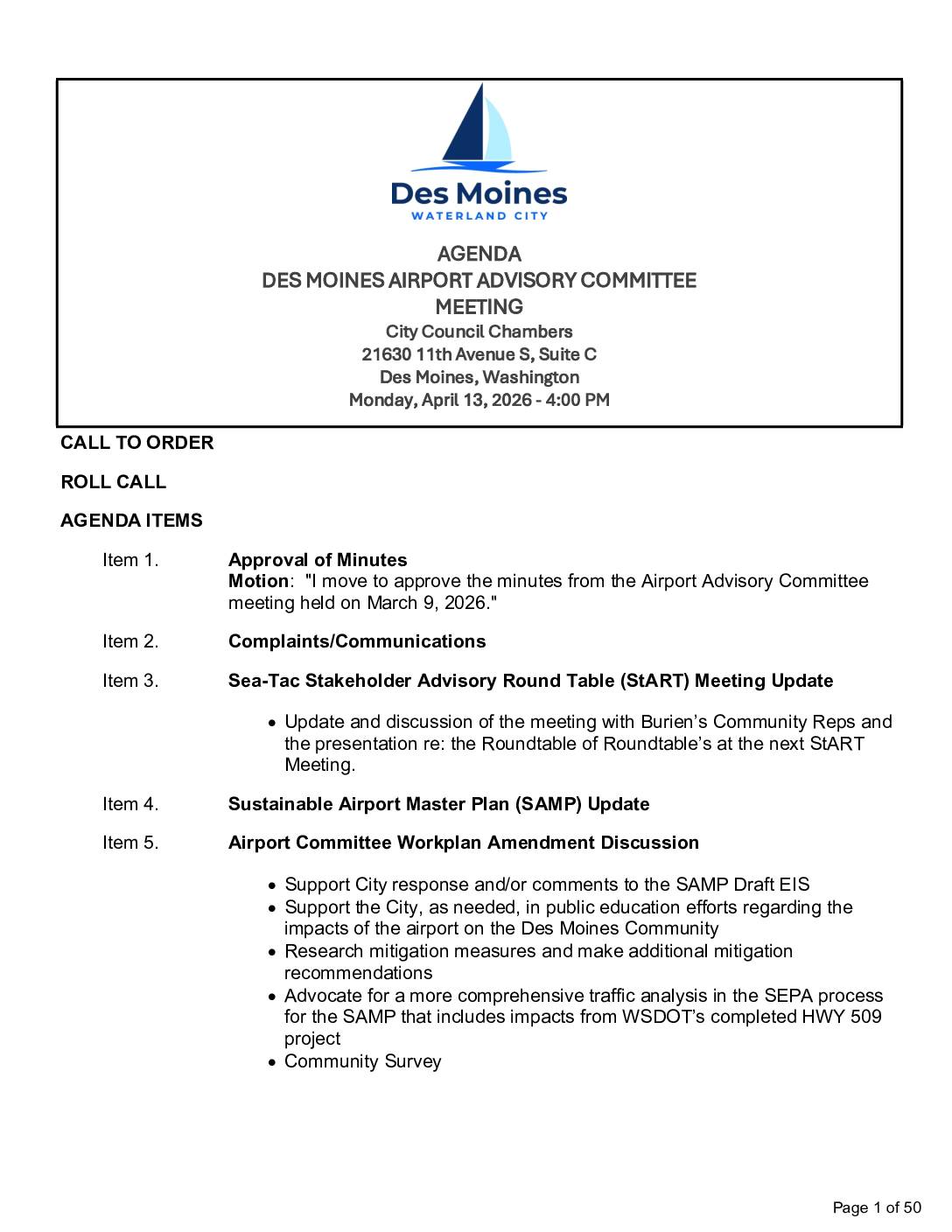 Meeting agenda for April 13, 2026 Des Moines Airport Advisory Committee meeting and minutes from the March 9, 2026 meeting. Agenda includes discussion of SAMP updates, StART meeting updates, committee workplan amendments, and support for city response to SAMP Draft EIS.