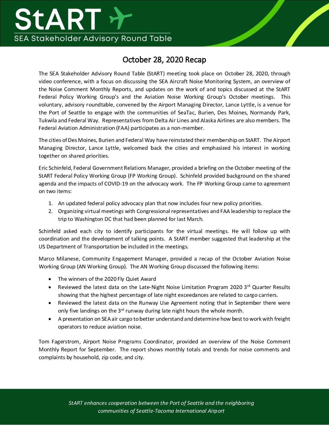 StART enhances cooperation between the Port of Seattle and the neighboring communities of Seattle-Tacoma International Airport October 28, 2020 Recap The SEA Stakeholder Advisory Round Table (StART) meeting took place on October 28, 2020, through video conference, with a focus on discussing the SEA Aircraft Noise Monitoring System, an overview of the Noise Comment Monthly Reports, and updates on the work of and topics discussed at the StART Federal Policy Working Group’s and the Aviation Noise Working Group’s October meetings. This voluntary, advisory roundtable, convened by the Airport Managing Director, Lance Lyttle, is a venue for the Port of Seattle to engage with the communities of SeaTac, Burien, Des Moines, Normandy Park, Tukwila and Federal Way. Representatives from Delta Air Lines and Alaska Airlines are also members. The Federal Aviation Administration (FAA) participates as a non-member. The cities of Des Moines, Burien and Federal Way have reinstated their membership on StART. The Airport Managing Director, Lance Lyttle, welcomed back the cities and emphasized his interest in working together on shared priorities. Eric Schinfeld, Federal Government Relations Manager, provided a briefing on the October meeting of the StART Federal Policy Working Group (FP Working Group). Schinfeld provided background on the shared agenda and the impacts of COVID-19 on the advocacy work. The FP Working Group came to agreement on two items: 1. An updated federal policy advocacy plan that now includes four new policy priorities. 2. Organizing virtual meetings with Congressional representatives and FAA leadership to replace the trip to Washington… -