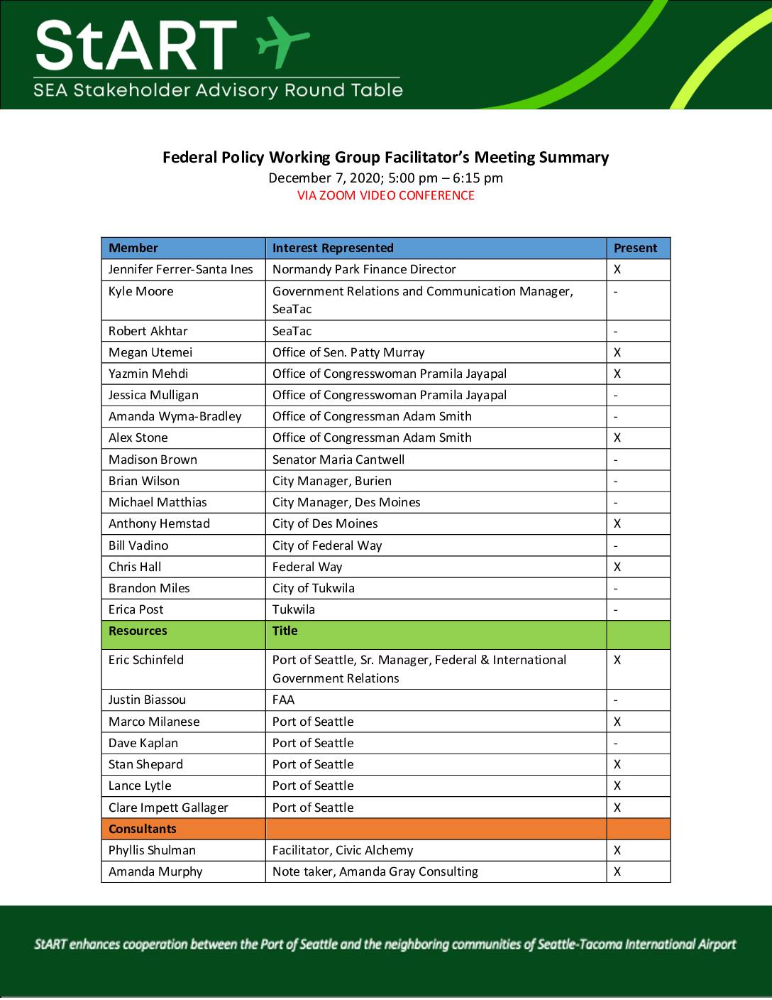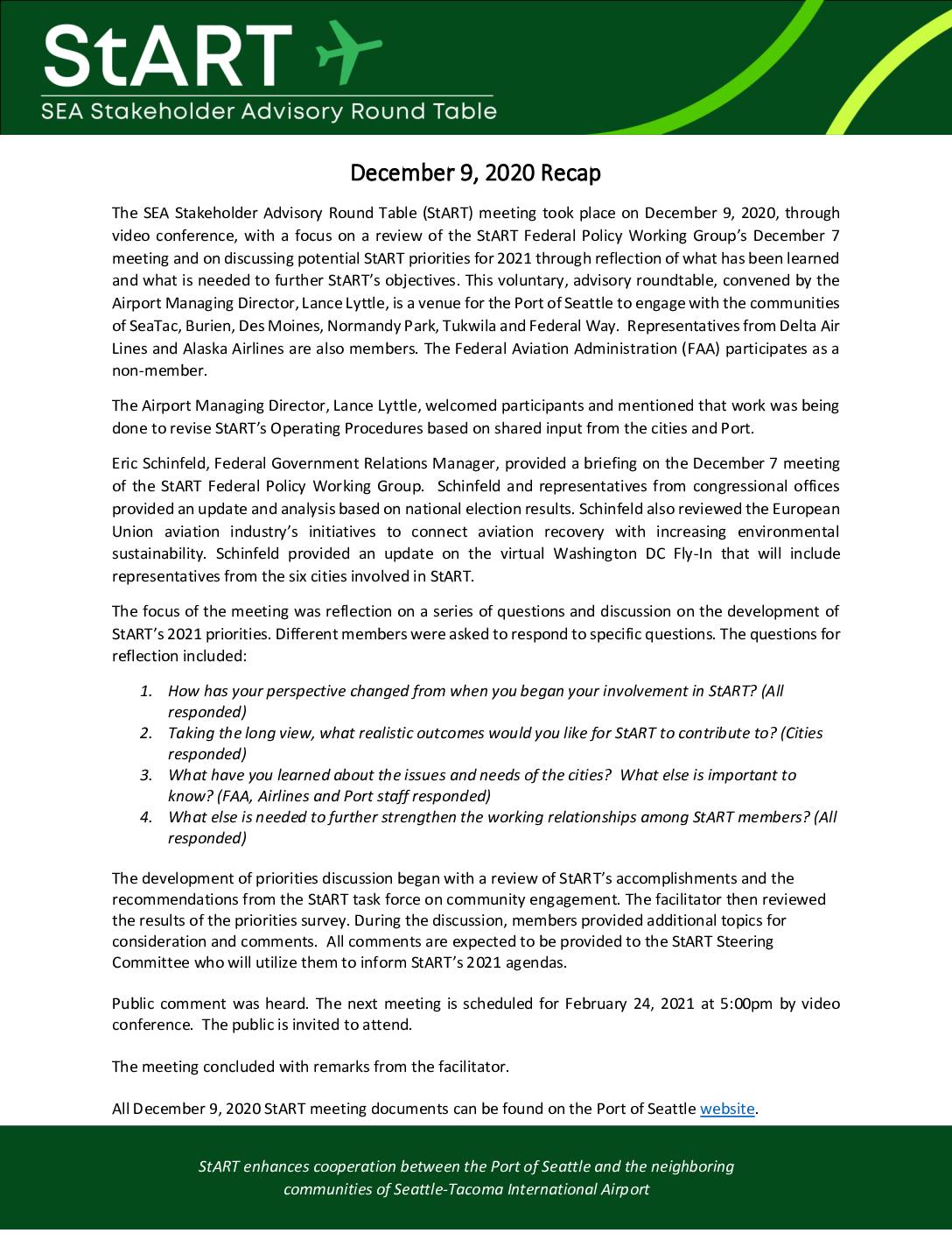StART enhances cooperation between the Port of Seattle and the neighboring communities of Seattle-Tacoma International Airport December 9, 2020 Recap The SEA Stakeholder Advisory Round Table (StART) meeting took place on December 9, 2020, through video conference, with a focus on a review of the StART Federal Policy Working Group’s December 7 meeting and on discussing potential StART priorities for 2021 through reflection of what has been learned and what is needed to further StART’s objectives. This voluntary, advisory roundtable, convened by the Airport Managing Director, Lance Lyttle, is a venue for the Port of Seattle to engage with the communities of SeaTac, Burien, Des Moines, Normandy Park, Tukwila and Federal Way. Representatives from Delta Air Lines and Alaska Airlines are also members. The Federal Aviation Administration (FAA) participates as a non-member. The Airport Managing Director, Lance Lyttle, welcomed participants and mentioned that work was being done to revise StART’s Operating Procedures based on shared input from the cities and Port. Eric Schinfeld, Federal Government Relations Manager, provided a briefing on the December 7 meeting of the StART Federal Policy Working Group. Schinfeld and representatives from congressional offices provided an update and analysis based on national election results. Schinfeld also reviewed the European Union aviation industry’s initiatives to connect aviation recovery with increasing environmental sustainability. Schinfeld provided an update on the virtual Washington DC Fly-In that will include representatives from the six cities involved in StART. The focus of the meeting was reflection on a series of questions and discussion… -
