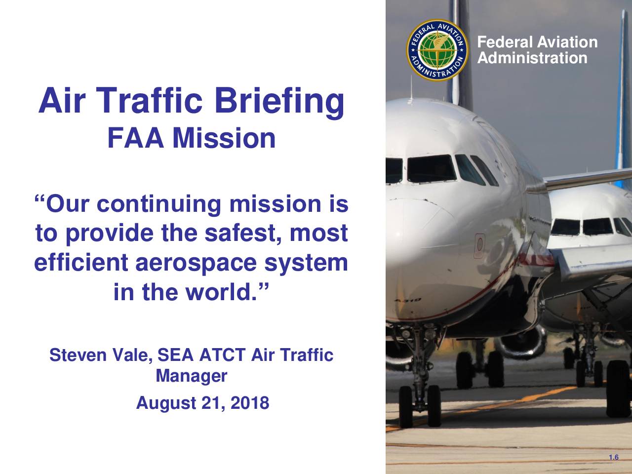 – SEA is slotted to receive Wake Turbulence Recategorization in October 2018. • Minimal foreseen impact to AAR/ADR due to fleet mix. – Glide Slope angle on 34R of 2.75 degrees was the industry standard when created • Still within current standards of 2.5 – 3 degrees Federal Aviation Administration Four Post System Federal Aviation Administration Four Post System Federal Aviation Administration Four Post System Federal Aviation Administration Fleet Mix Changes In 2005, turboprops accounted for 33% of the aircraft operating at SEA. In 2017, the percentage of turboprop aircraft was 17%. The percentage of aircraft classified as “heavy” have also increased during this timeframe. Federal Aviation Administration SEA Traffic Counts • 1998 – 407,597 • 1999 – 433,660 • 2000 – 445,677 (steady drop 2001 to 2012) • 2012 – 309,597 • 2016 – 412,170 • 2017 – 416,136 (10% increase year over year 2013-2016) • 2018 – projected – 435,000, about 1999 numbers Federal Aviation Administration Thank you. -