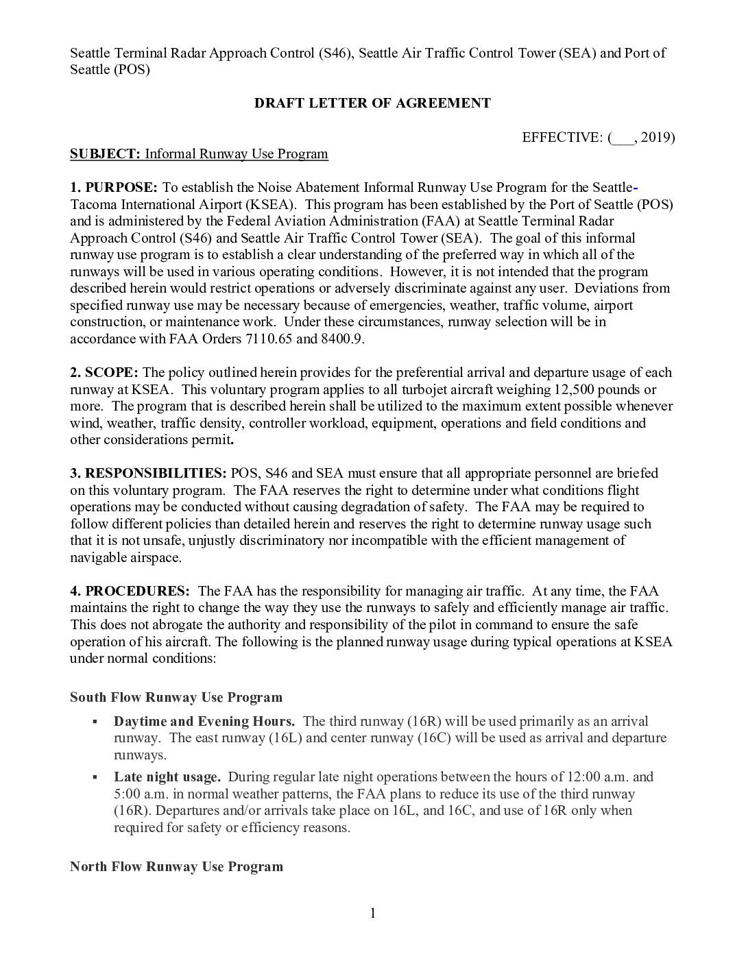 Seattle Terminal Radar Approach Control (S46), Seattle Air Traffic Control Tower (SEA) and Port of Seattle (POS) DRAFT LETTER OF AGREEMENT EFFECTIVE: (___, 2019) SUBJECT: Informal Runway Use Program 1. PURPOSE: To establish the Noise Abatement Informal Runway Use Program for the Seattle- Tacoma International Airport (KSEA). This program has been established by the Port of Seattle (POS) and is administered by the Federal Aviation Administration (FAA) at Seattle Terminal Radar Approach Control (S46) and Seattle Air Traffic Control Tower (SEA). The goal of this informal runway use program is to establish a clear understanding of the preferred way in which all of the runways will be used in various operating conditions. However, it is not intended that the program described herein would restrict operations or adversely discriminate against any user. Deviations from specified runway use may be necessary because of emergencies, weather, traffic volume, airport construction, or maintenance work. Under these circumstances, runway selection will be in accordance with FAA Orders 7110.65 and 8400.9. 2. SCOPE: The policy outlined herein provides for the preferential arrival and departure usage of each runway at KSEA. This voluntary program applies to all turbojet aircraft weighing 12,500 pounds or more. The program that is described herein shall be utilized to the maximum extent possible whenever wind, weather, traffic density, controller workload, equipment, operations and field conditions and other considerations permit. 3. RESPONSIBILITIES: POS, S46 and SEA must ensure that all appropriate personnel are briefed on this voluntary program. The FAA reserves the right… -