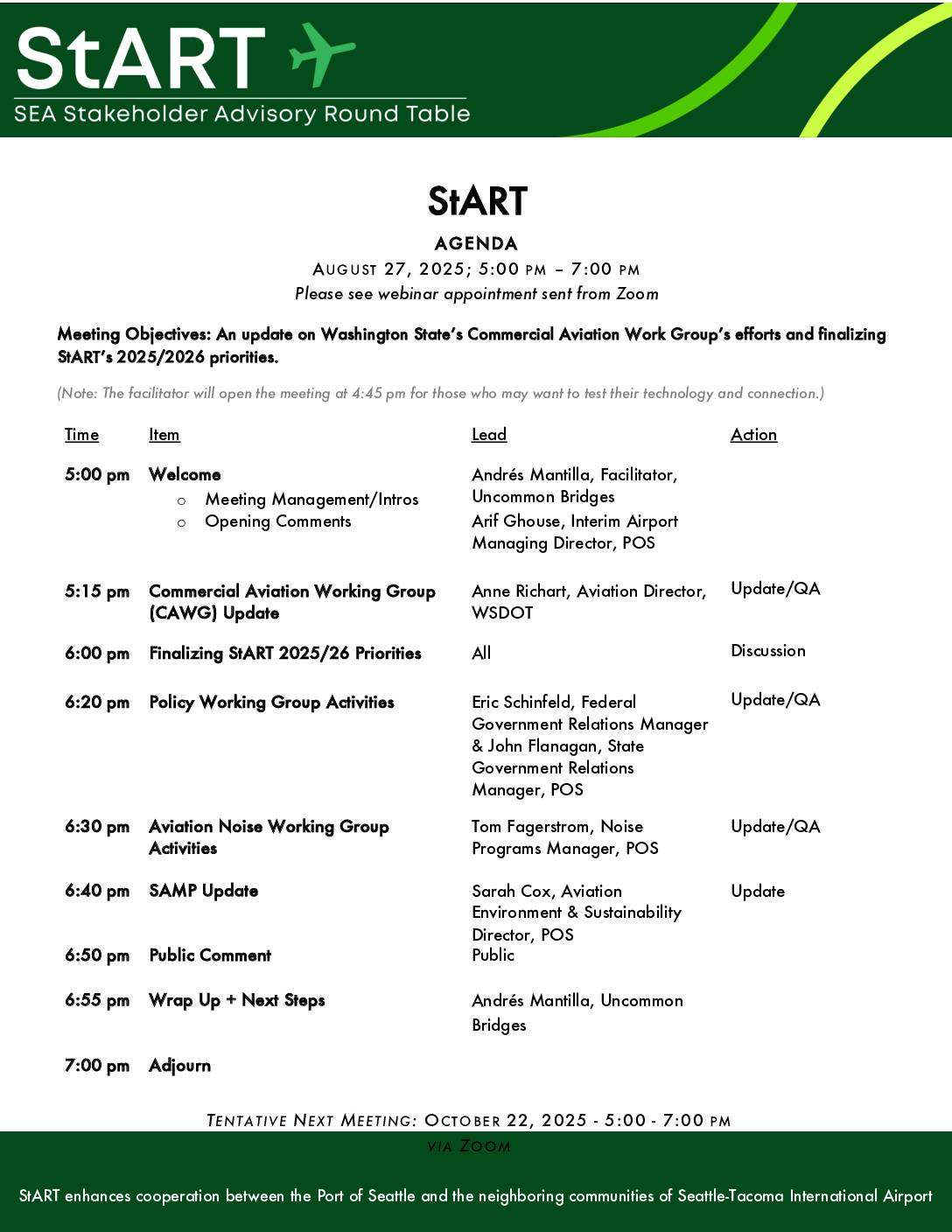 StART Meeting Agenda October 22, 2025 SAMP NTP Final NEPA EA, FAA Record of Decision, and SEPA Next Steps Presentation 10-22-25 OPENING REMARKS **Andreas Mantilla (Facilitator, Uncommon Bridges):** As we begin always welcome, good to see you all. My name is Andreas and I don’t think we have anybody new at this point, but I’m -