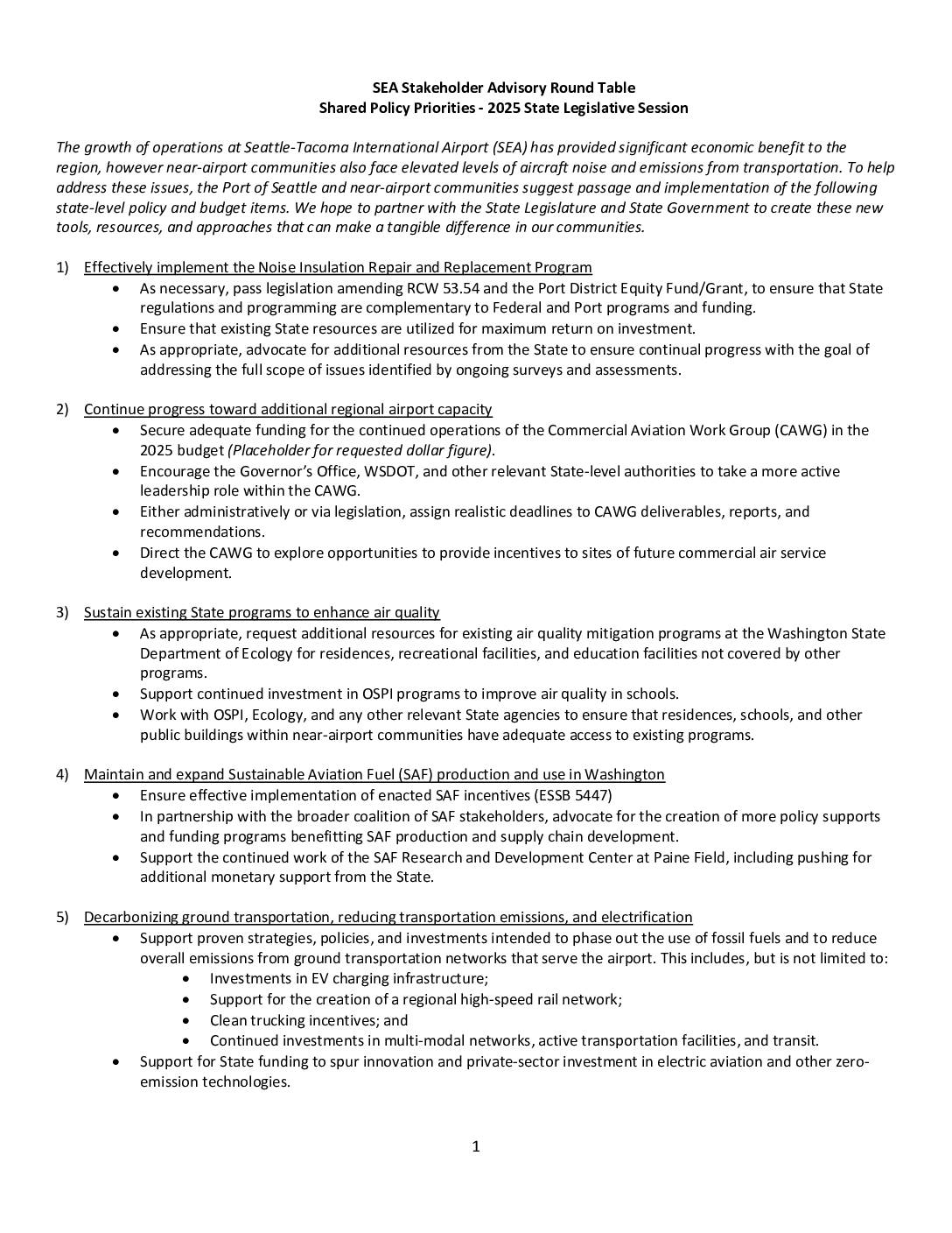 Shared Policy Priorities - 2025 State Legislative Session The growth of operations at Seattle-Tacoma International Airport (SEA) has provided significant economic benefit to the region, however near-airport communities also face elevated levels of aircraft noise and emissions from transportation. To help address these issues, the Port of Seattle and near-airport communities suggest passage and implementation of the following state-level policy and budget items. We hope to partner with the State Legislature and State Government to create these new tools, resources, and approaches that can make a tangible difference in our communities. 1) Effectively implement the Noise Insulation Repair and Replacement Program As necessary, pass legislation amending RCW 53.54 and the Port District Equity Fund/Grant, to ensure that State regulations and programming are complementary to Federal and Port programs and funding. Ensure that existing State resources are utilized for maximum return on investment. As appropriate, advocate for additional resources from the State to ensure continual progress with the goal of addressing the full scope of issues identified by ongoing surveys and assessments. 2) Continue progress toward additional regional airport capacity Secure adequate funding for the continued operations of the Commercial Aviation Work Group (CAWG) in the 2025 budget (Placeholder for requested dollar figure). Encourage the Governor’s Office, WSDOT, and other relevant State-level authorities to take a more active leadership role within the CAWG. Either administratively or via legislation, assign realistic deadlines to CAWG deliverables, reports, and recommendations. Direct the CAWG to explore opportunities to… -
