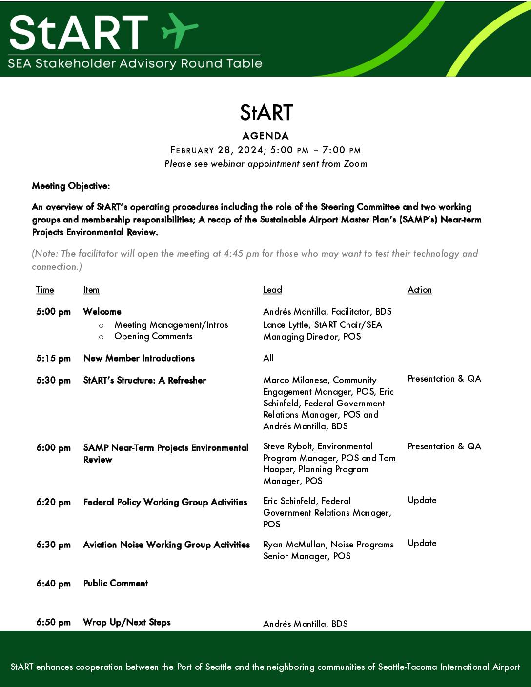 StART enhances cooperation between the Port of Seattle and the neighboring communities of Seattle-Tacoma International Airport StART AAGGEENNDDAA FEBRUARY 28, 2024; 5:00 PM – 7:00 PM Please see webinar appointment sent from Zoom MMeeeettiinngg OObbjjeeccttiivvee:: AAnn oovveerrvviieeww ooff SSttAARRTT’’ss ooppeerraattiinngg pprroocceedduurreess iinncclluuddiinngg tthhee rroollee ooff tthhee SStteeeerriinngg CCoommmmiitttteeee aanndd ttwwoo wwoorrkkiinngg ggrroouuppss aanndd mmeemmbbeerrsshhiipp rreessppoonnssiibbiilliittiieess;; AA rreeccaapp ooff tthhee SSuussttaaiinnaabbllee AAiirrppoorrtt MMaasstteerr PPllaann’’ss ((SSAAMMPP’’ss)) NNeeaarr--tteerrmm PPrroojjeeccttss EEnnvviirroonnmmeennttaall RReevviieeww.. (Note: The facilitator will open the meeting at 4:45 pm for those who may want to test their technology and connection.) Time Item Lead Action 55::0000 ppmm WWeellccoommee o Meeting Management/Intros o Opening Comments Andrés Mantilla, Facilitator, BDS Lance Lyttle, StART Chair/SEA Managing Director, POS 55::1155 ppmm NNeeww MMeemmbbeerr IInnttrroodduuccttiioonnss All 55::3300 ppmm