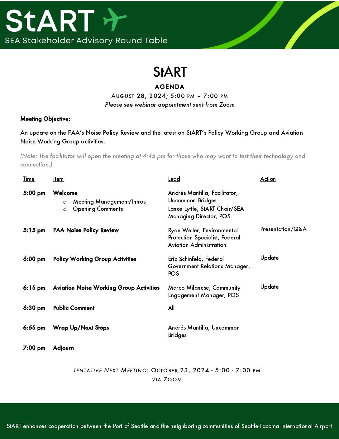 StART enhances cooperation between the Port of Seattle and the neighboring communities of Seattle-Tacoma International Airport StART AAGGEENNDDAA AUGUST 28, 2024; 5:00 PM – 7:00 PM Please see webinar appointment sent from Zoom MMeeeettiinngg OObbjjeeccttiivvee:: An update on the FAA’s Noise Policy Review and the latest on StART’s Policy Working Group and Aviation Noise Working Group activities. (Note: The facilitator will open the meeting at 4:45 pm for those who may want to test their technology and connection.) Time Item Lead Action 55::0000 ppmm WWeellccoommee o Meeting Management/Intros o Opening Comments Andrés Mantilla, Facilitator, Uncommon Bridges Lance Lyttle, StART Chair/SEA Managing Director, POS 55::1155 ppmm FFAAAA NNooiissee PPoolliiccyy RReevviieeww Ryan Weller, Environmental Protection Specialist, Federal Aviation Administration Presentation/Q&A 66::0000 ppmm PPoolliiccyy WWoorrkkiinngg GGrroouupp AAccttiivviittiieess Eric Schinfeld, Federal Government Relations Manager, POS Update 66::1155 ppmm AAvviiaattiioonn NNooiissee WWoorrkkiinngg GGrroouupp AAccttiivviittiieess Marco Milanese, Community Engagement Manager, POS Update 66::3300 ppmm PPuubblliicc CCoommmmeenntt All 66::5555 ppmm WWrraapp UUpp//NNeexxtt SStteeppss Andrés Mantilla, Uncommon Bridges 77::0000 ppmm AAddjjoouurrnn TENTATIVE NEXT MEET ING : OCTOBER 23, 2024 - 5:00 - 7:00 PM VIA ZOOM -