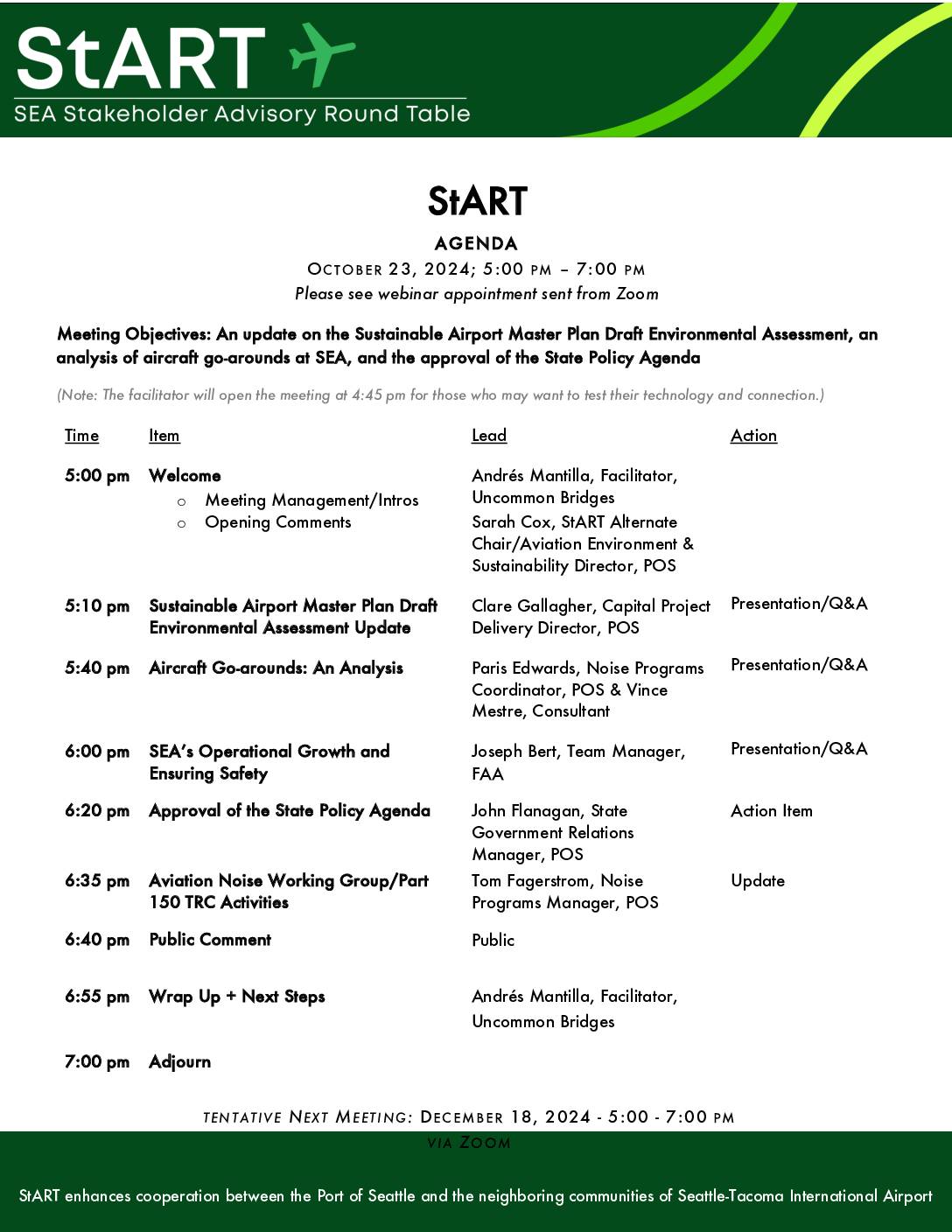 StART enhances cooperation between the Port of Seattle and the neighboring communities of Seattle-Tacoma International Airport SSttAARRTT AAGGEENNDDAA OCTOBER 23, 2024; 5:00 PM – 7:00 PM Please see webinar appointment sent from Zoom MMeeeettiinngg OObbjjeeccttiivveess:: AAnn uuppddaattee oonn tthhee SSuussttaaiinnaabbllee AAiirrppoorrtt MMaasstteerr PPllaann DDrraafftt EEnnvviirroonnmmeennttaall AAsssseessssmmeenntt,, aann aannaallyyssiiss ooff aaiirrccrraafftt ggoo--aarroouunnddss aatt SSEEAA,, aanndd tthhee aapppprroovvaall ooff tthhee SSttaattee PPoolliiccyy AAggeennddaa (Note: The facilitator will open the meeting at 4:45 pm for those who may want to test their technology and connection.) Time Item Lead Action 55::0000 ppmm WWeellccoommee o Meeting Management/Intros o Opening Comments Andrés Mantilla, Facilitator, Uncommon Bridges Sarah Cox, StART Alternate Chair/Aviation Environment & Sustainability Director, POS 55::1100 ppmm SSuussttaaiinnaabbllee AAiirrppoorrtt MMaasstteerr PPllaann DDrraafftt EEnnvviirroonnmmeennttaall AAsssseessssmmeenntt UUppddaattee Clare Gallagher, Capital Project Delivery Director, POS Presentation/Q&A 55::4400 ppmm AAiirrccrraafftt GGoo--aarroouunnddss:: AAnn AAnnaallyyssiiss Paris Edwards, Noise Programs Coordinator, POS & Vince Mestre, Consultant Presentation/Q&A 66::0000 ppmm SSEEAA’’ss OOppeerraattiioonnaall GGrroowwtthh aanndd EEnnssuurriinngg SSaaffeettyy Joseph Bert, Team Manager, FAA Presentation/Q&A 66::2200 ppmm AApppprroovvaall ooff tthhee SSttaattee PPoolliiccyy AAggeennddaa John Flanagan, State Government Relations Manager, POS Action Item 66::3355 ppmm AAvviiaattiioonn NNooiissee WWoorrkkiinngg GGrroouupp//PPaarrtt 115500 TTRRCC AAccttiivviittiieess Tom Fagerstrom, Noise Programs Manager, POS Update 66::4400 ppmm PPuubblliicc CCoommmmeenntt Public 66::5555 ppmm WWrraapp UUpp ++ NNeexxtt SStteeppss Andrés Mantilla, Facilitator, Uncommon Bridges 77::0000 ppmm AAddjjoouurrnn TENTATIVE NEXT MEET ING : DECEMBER 18, 2024 - 5:00 - 7:00 PM VIA ZOOM -