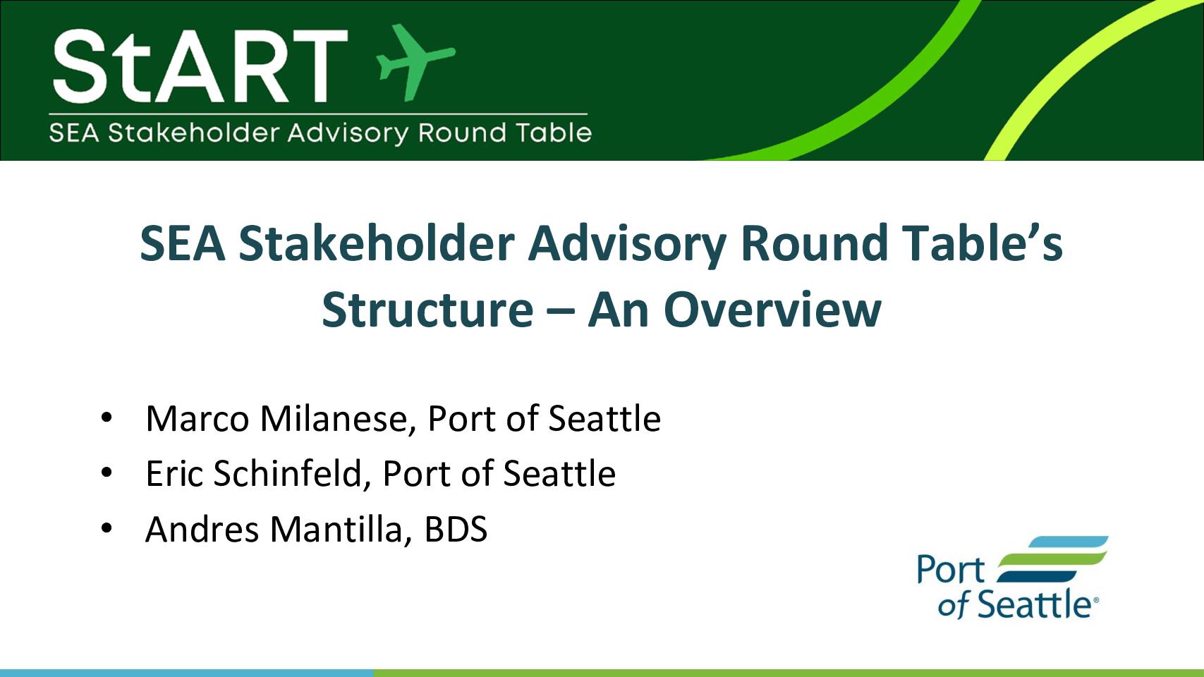 • Information-sharing between the Port and the near-airport cities • Discussing near-airport cities’ concerns • Providing feedback to the Port on airport related-issues • Identify opportunities for collaboration StART focuses on practical solutions to address community concerns about the airport and about aircraft noise and emissions StART History • StART’s creation based on Port desire to enhance cooperation between Port and near-airport cities • Conducted extensive research at other airports on their community engagement strategies • Over several months, worked closely with consultant and near-airport city leadership to develop StART • Inaugural meeting: February 28, 2018 • Operating Procedures revised in 2021 • Port provides StART with staff support and technical expertise • Chaired by the Airport Managing Director • Meetings managed by an independent/neutral facilitator • Formal relationship with the Highline Forum • Voluntary, non-governing advisory roundtable • Strives to operate by consensus StART Organizational Structure StART Organizational Structure Steering Committee SEA Stakeholder Advisory Round Table Aviation Noise Working Group Federal Policy Working Group • Provides support, guidance and strategic direction for StART • Includes the chair, the facilitator, airline reps, an FAA rep, Port staff and the six city reps • Responsibilities include: – Setting meeting agendas – Amending the operating procedures – Approving external communications – Provide feedback on the facilitator Steering Committee • Purpose • Sponsorship • Reporting Structure with Highline Forum • Membership • Adherence to Operating Procedures • FAA • Steering Committee • Facilitator • Meetings – Frequency, Recordings, Meeting Attendance, Location, Notification, Agendas,… -