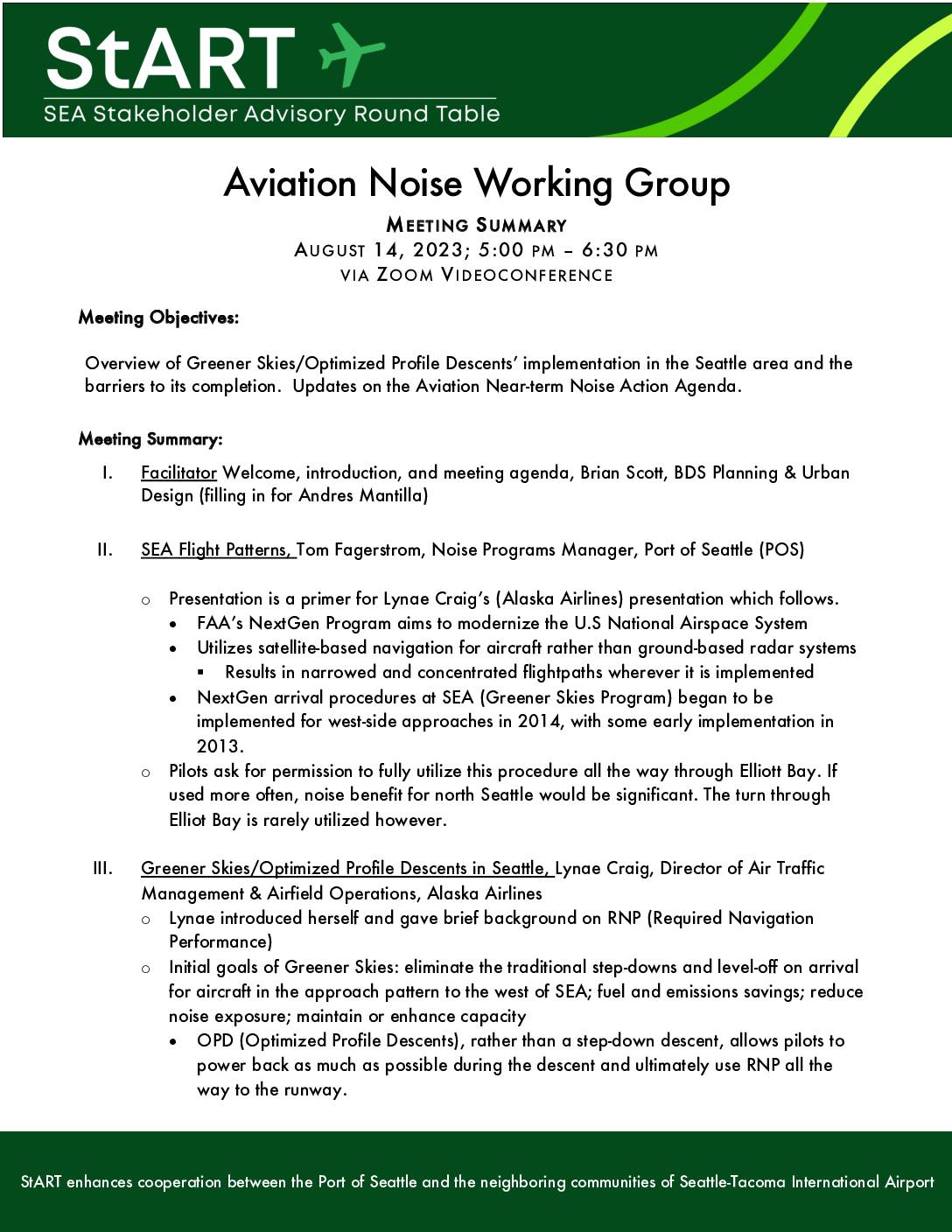 StART enhances cooperation between the Port of Seattle and the neighboring communities of Seattle-Tacoma International Airport Aviation Noise Working Group MMEEEETTIINNGG SSUUMMMMAARRYY AUGUST 14, 2023; 5:00 PM – 6:30 PM VIA ZOOM V IDEOCONFERENCE MMeeeettiinngg OObbjjeeccttiivveess:: Overview of Greener Skies/Optimized Profile Descents’ implementation in the Seattle area and the barriers to its completion. Updates on the Aviation Near-term Noise Action Agenda. MMeeeettiinngg SSuummmmaarryy:: I. Facilitator Welcome, introduction, and meeting agenda, Brian Scott, BDS Planning & Urban Design (filling in for Andres Mantilla) II. SEA Flight Patterns, Tom Fagerstrom, Noise Programs Manager, Port of Seattle (POS) o Presentation is a primer for Lynae Craig’s (Alaska Airlines) presentation which follows. • FAA’s NextGen Program aims to modernize the U.S National Airspace System • Utilizes satellite-based navigation for aircraft rather than ground-based radar systems § Results in narrowed and concentrated flightpaths wherever it is implemented • NextGen arrival procedures at SEA (Greener Skies Program) began to be implemented for west-side approaches in 2014, with some early implementation in 2013. o Pilots ask for permission to fully utilize this procedure all the way through Elliott Bay. If used more often, noise benefit for north Seattle would be significant. The turn through Elliot Bay is rarely utilized however. III. Greener Skies/Optimized Profile Descents in Seattle, Lynae Craig, Director of Air Traffic Management & Airfield Operations, Alaska Airlines o Lynae introduced herself and gave brief background on RNP (Required Navigation Performance) o Initial goals of Greener Skies: eliminate the traditional step-downs and level-off on arrival for…